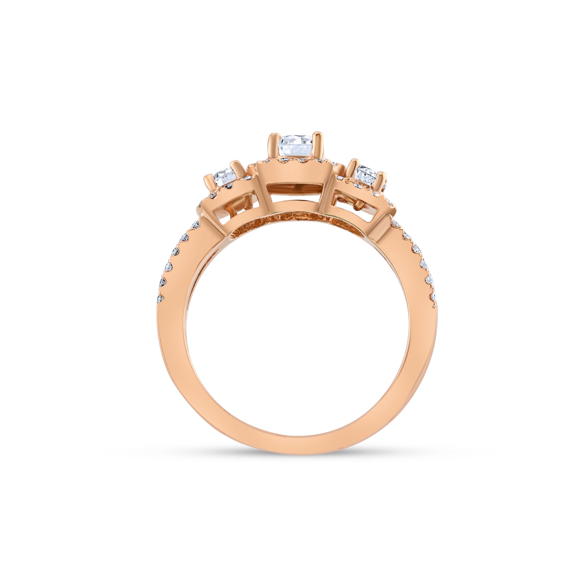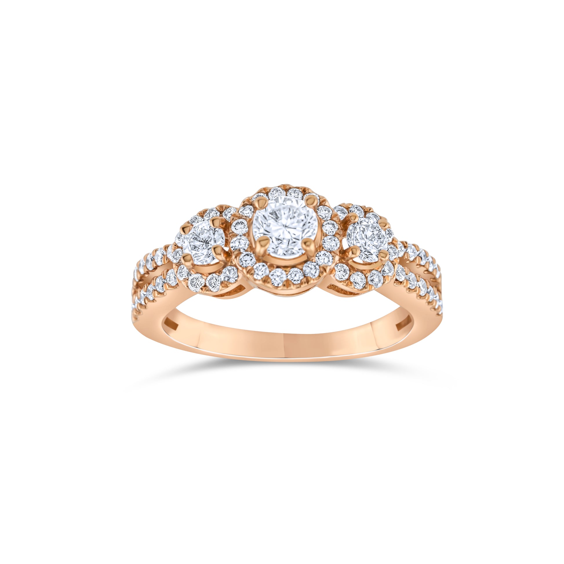 14K Rose Gold Diamond Halo Three-Stone Engagement Ring 1.15 Ct