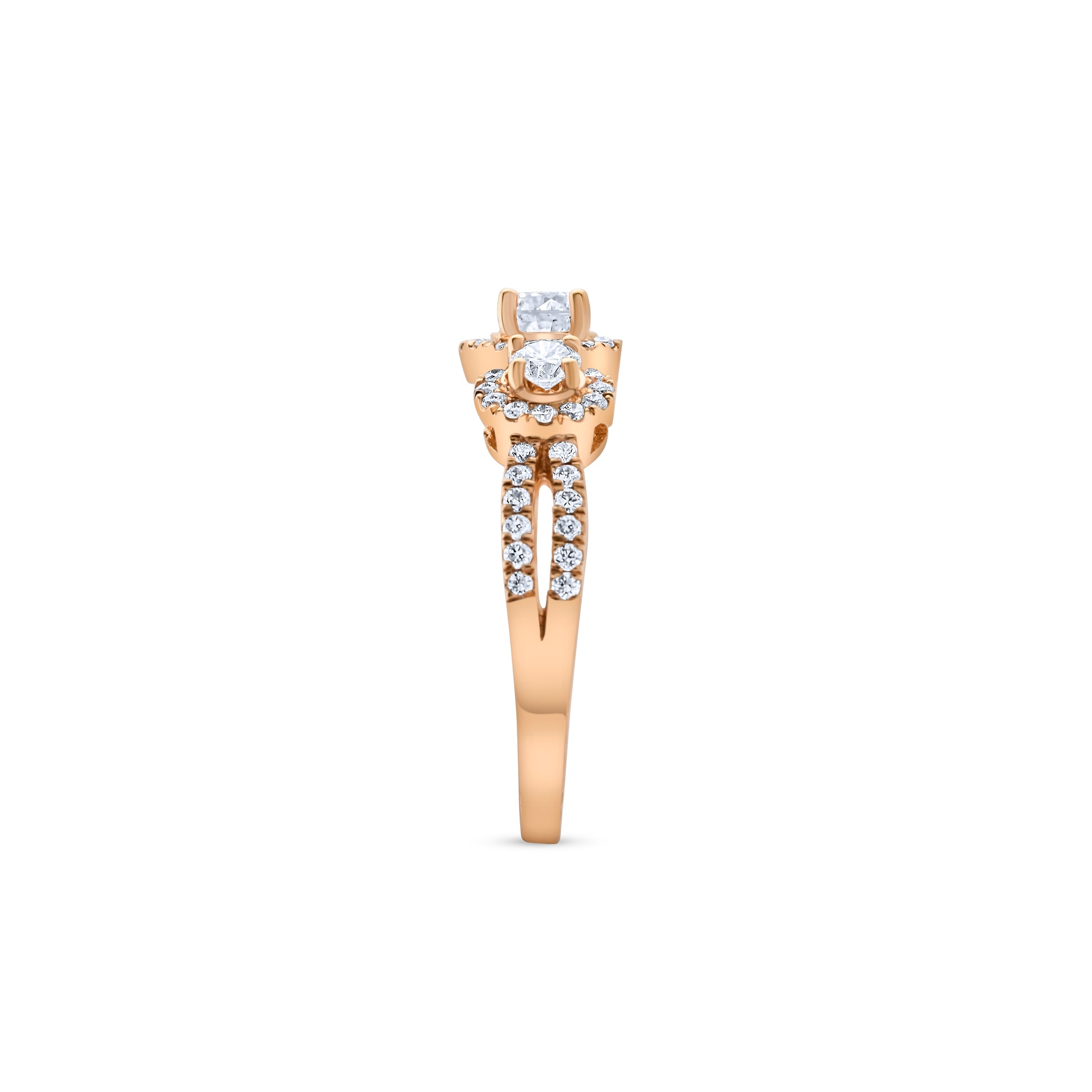 A romantic flourish of sparkle and grace, this rose gold ring dazzles with its trio of brilliant halos and split-shank band kissed with light. A radiant symbol of love’s past, present, and future, it’s made to celebrate moments that last forever.