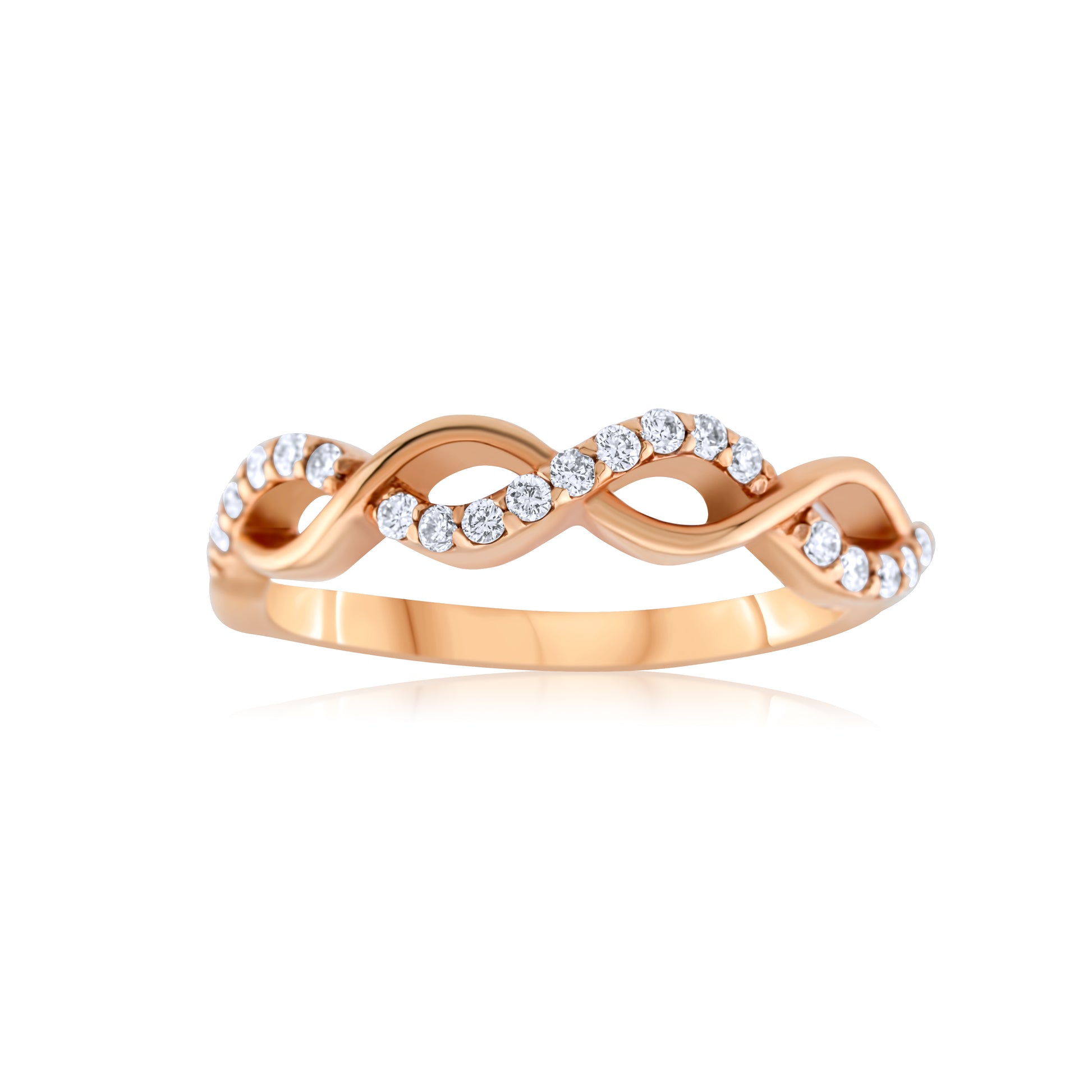 Gracefully entwined, this rose gold band shimmers with delicate brilliance, its flowing curves symbolizing love’s eternal bond. Romantic and refined, it is a perfect harmony of warmth and light.