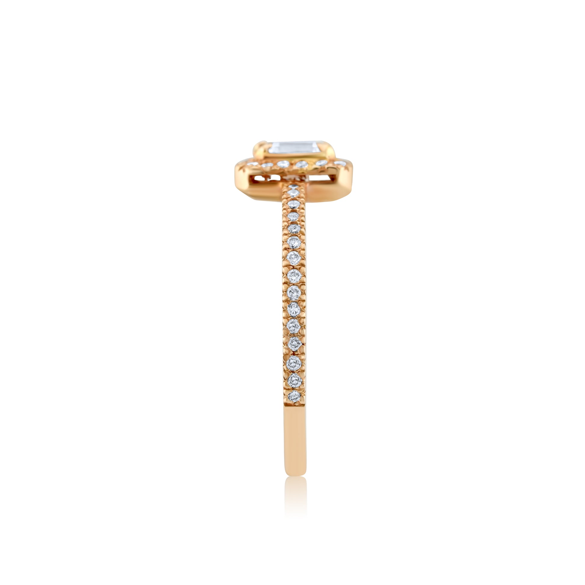 An emerald-cut diamond glows with refined brilliance, embraced by a halo of light and a pavé rose gold band. Graceful and everlasting, this design captures romance in its most luminous form.