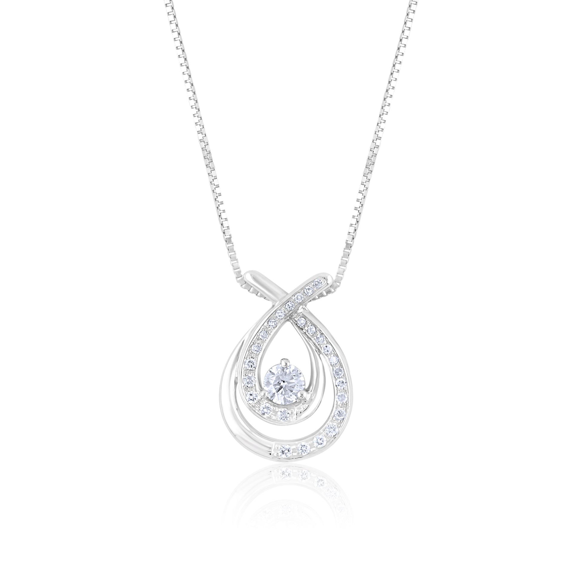 Two graceful arcs of light embrace a brilliant center diamond, symbolizing unity and eternal love. Fluid and radiant, this pendant captures the poetry of motion and timeless sophistication.