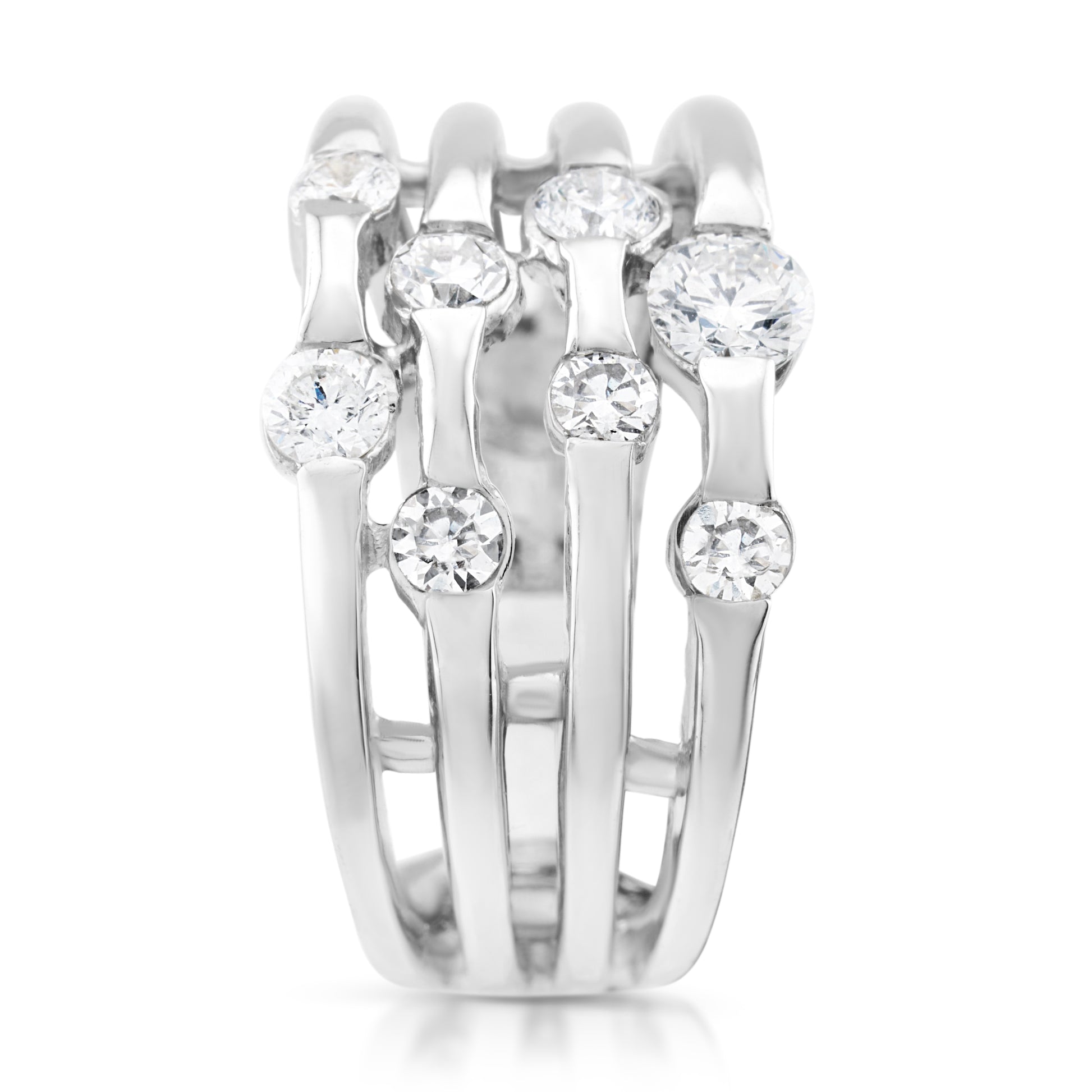 This contemporary ring dazzles with scattered bezel-set diamonds that appear to float across sleek, polished bands. Its fluid, layered design delivers a bold yet minimalist look—perfect for everyday luxury with an edge.