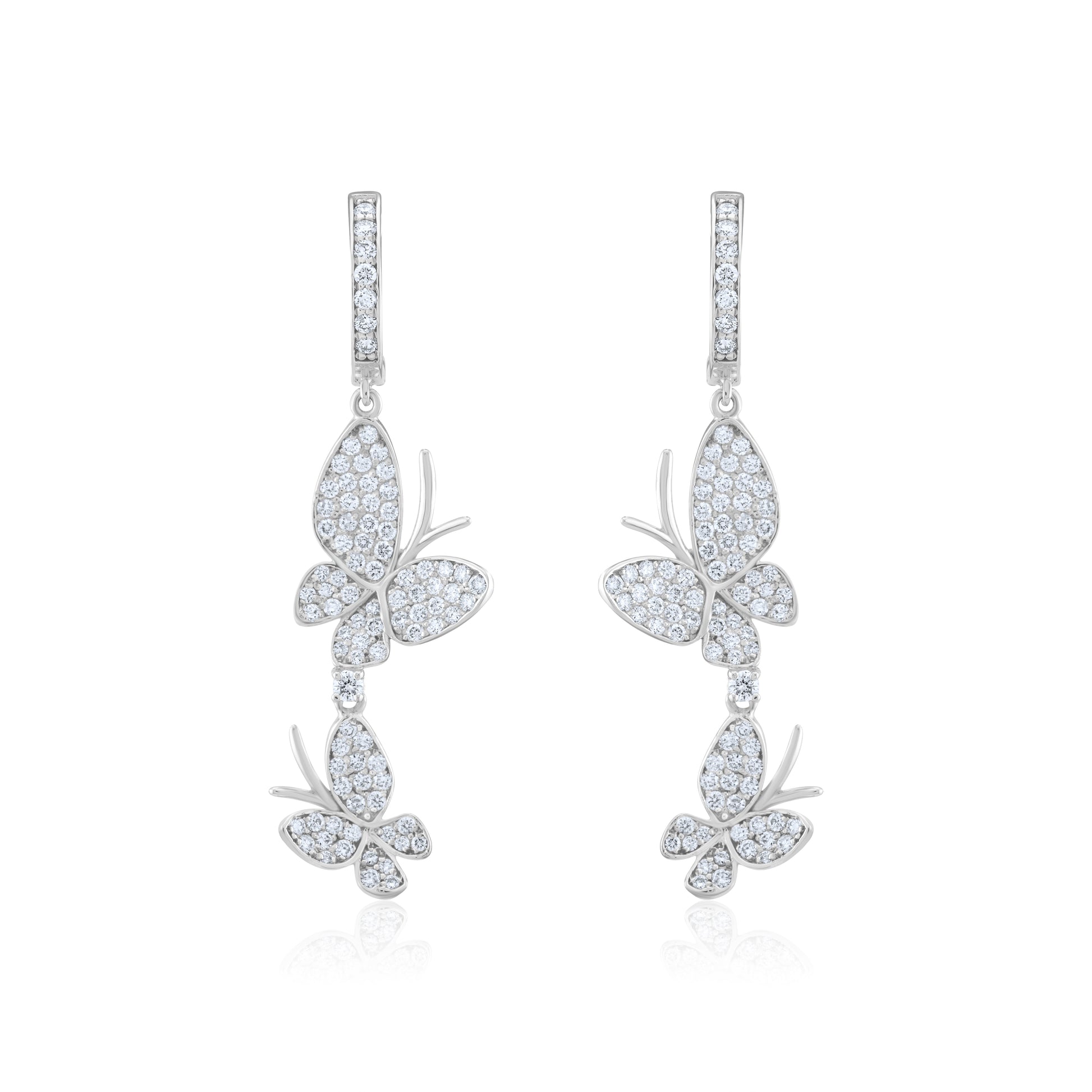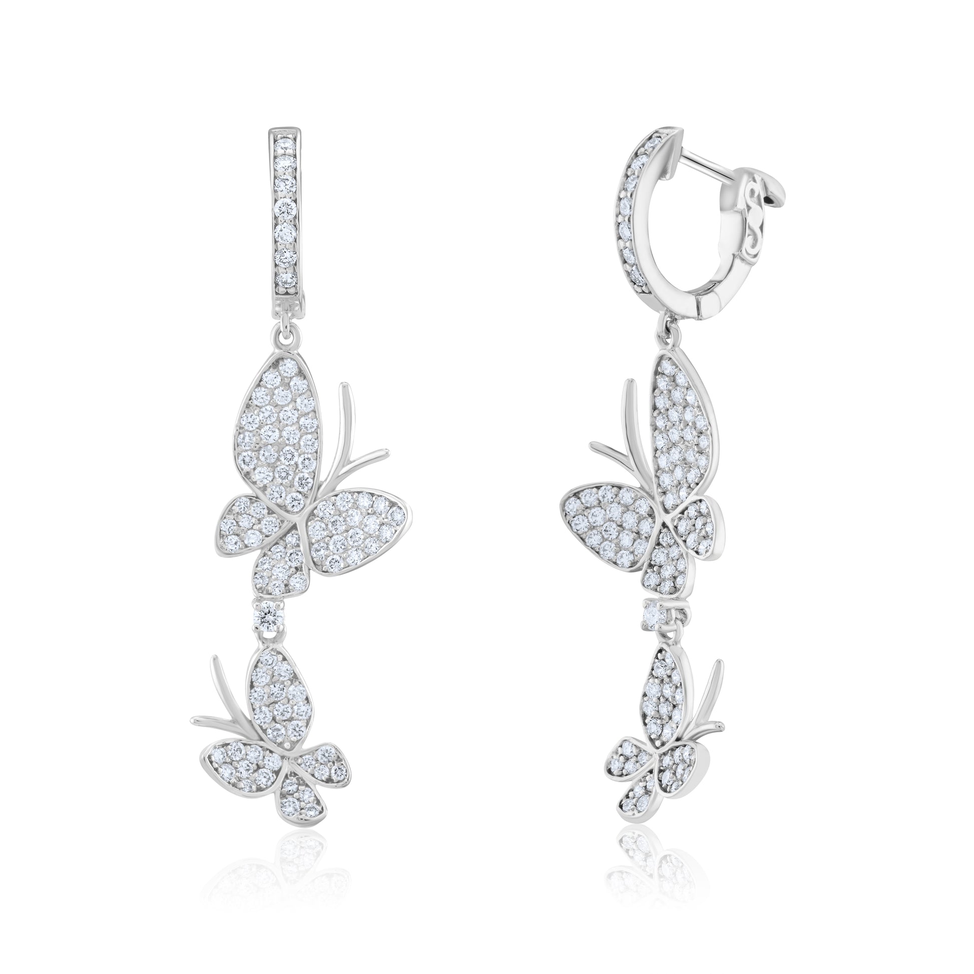 14K White Gold Diamond Butterfly Dangling Earrings 1.35 Ct