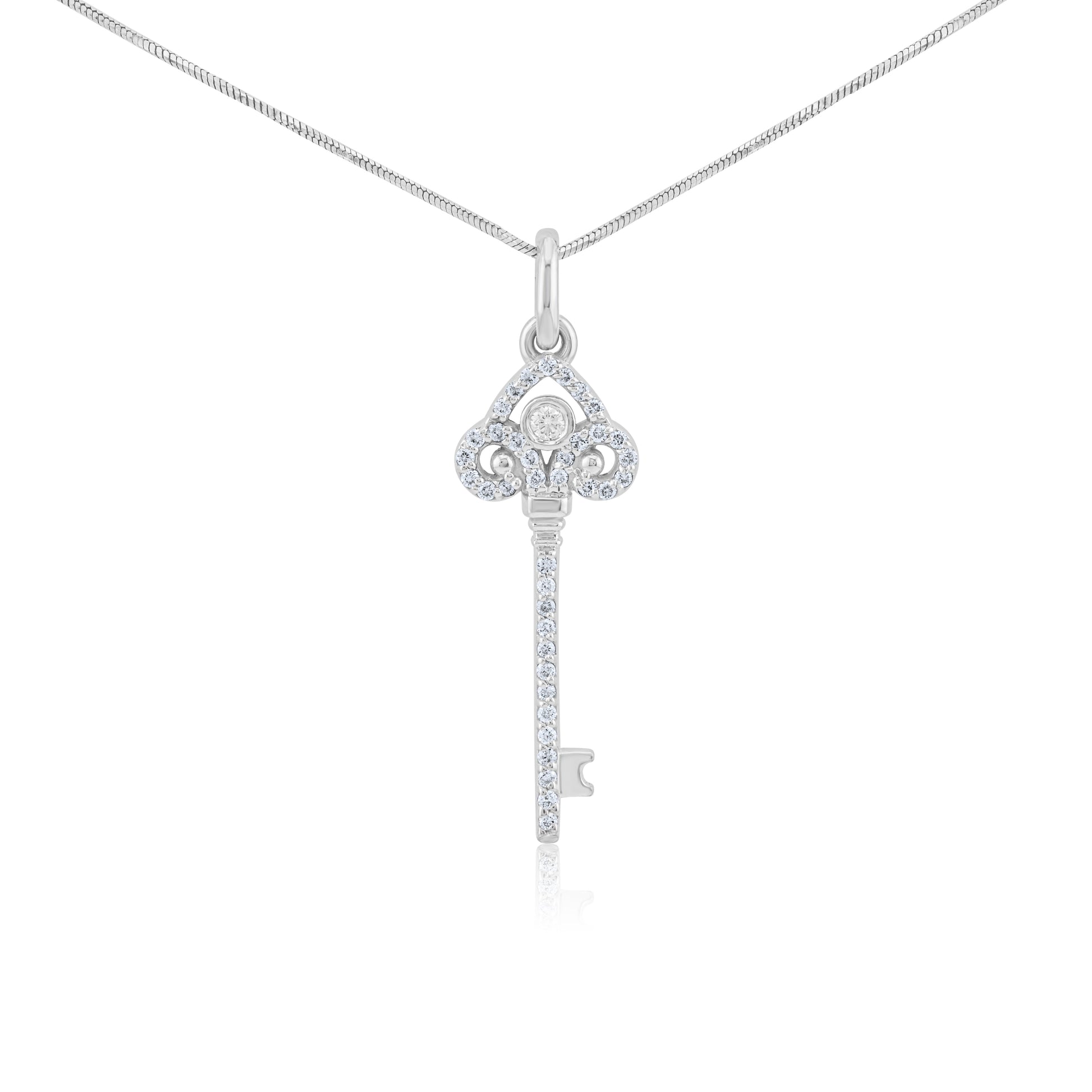 Unlock timeless elegance with this dazzling key-shaped pendant, adorned with brilliant diamonds that shimmer with every movement. A symbol of love, luck, and new beginnings, it’s the perfect keepsake for life’s most meaningful moments.