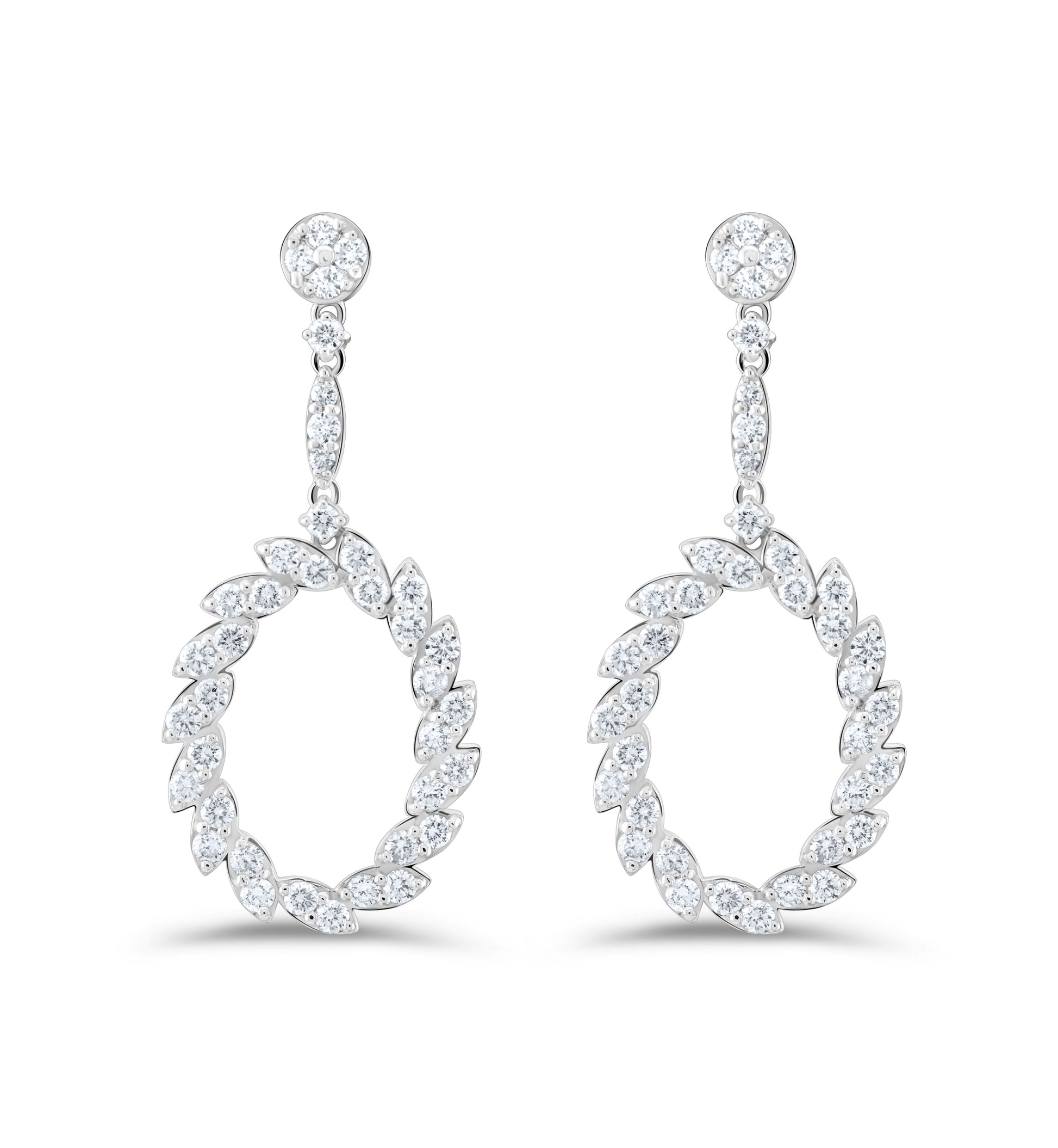 Inspired by nature’s elegance, these diamond wreath earrings feature marquise-shaped accents that shimmer with every turn. Crafted in 14K white gold and secured with a push backing, they offer a refined yet radiant touch to elevate any ensemble.
