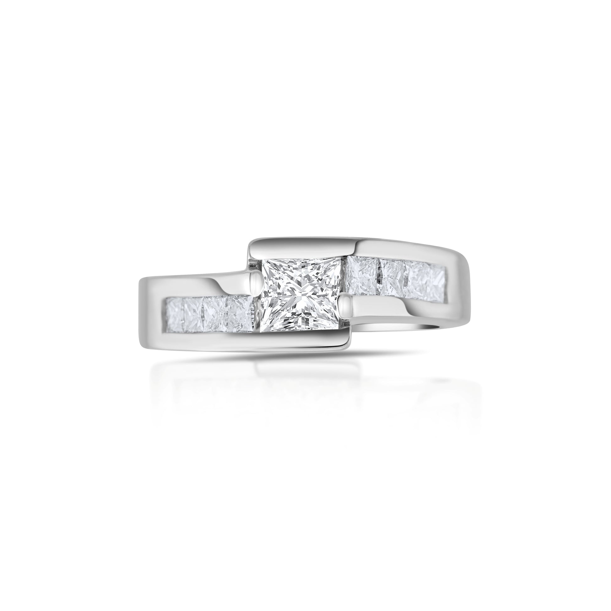 A striking princess-cut diamond is seamlessly framed by channel-set stones, creating a bold yet refined silhouette. Modern and everlasting, this design is a powerful statement of love and dazzle.