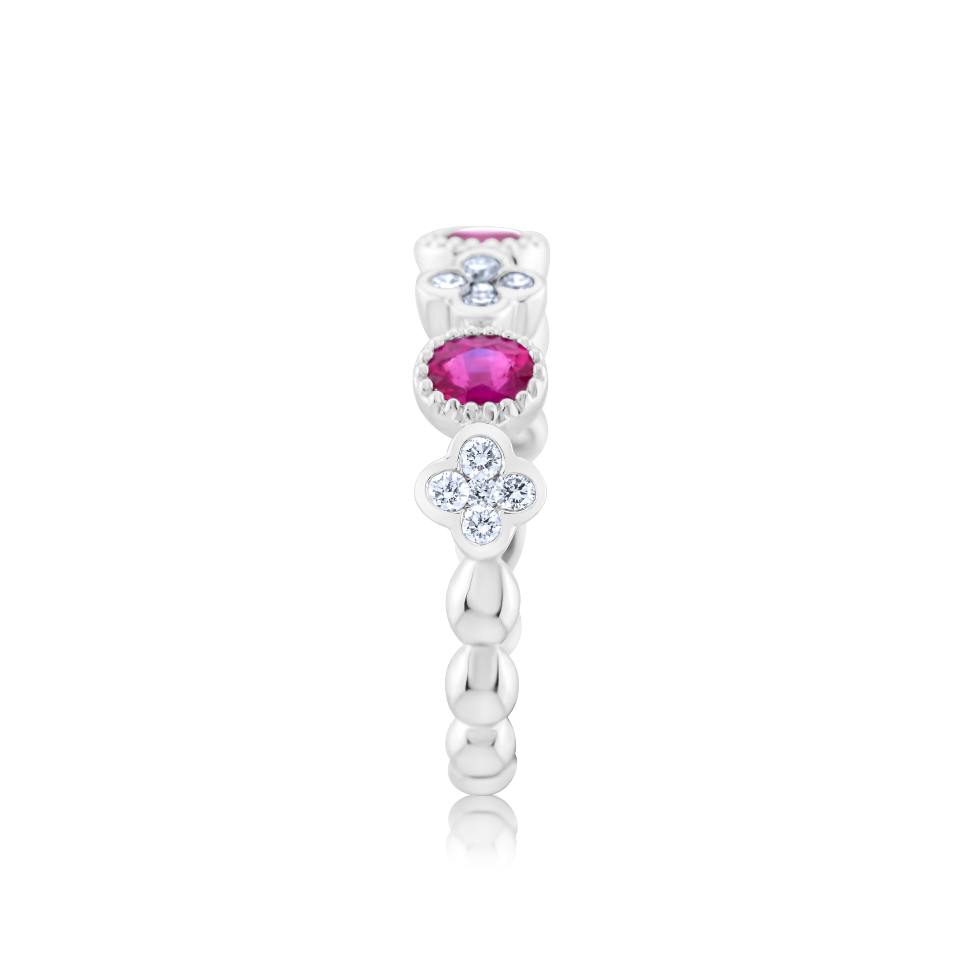 Delicate diamond blossoms bloom between radiant rubies, weaving a tale of beauty and grace. A charming ode to love, where elegance meets timeless allure.