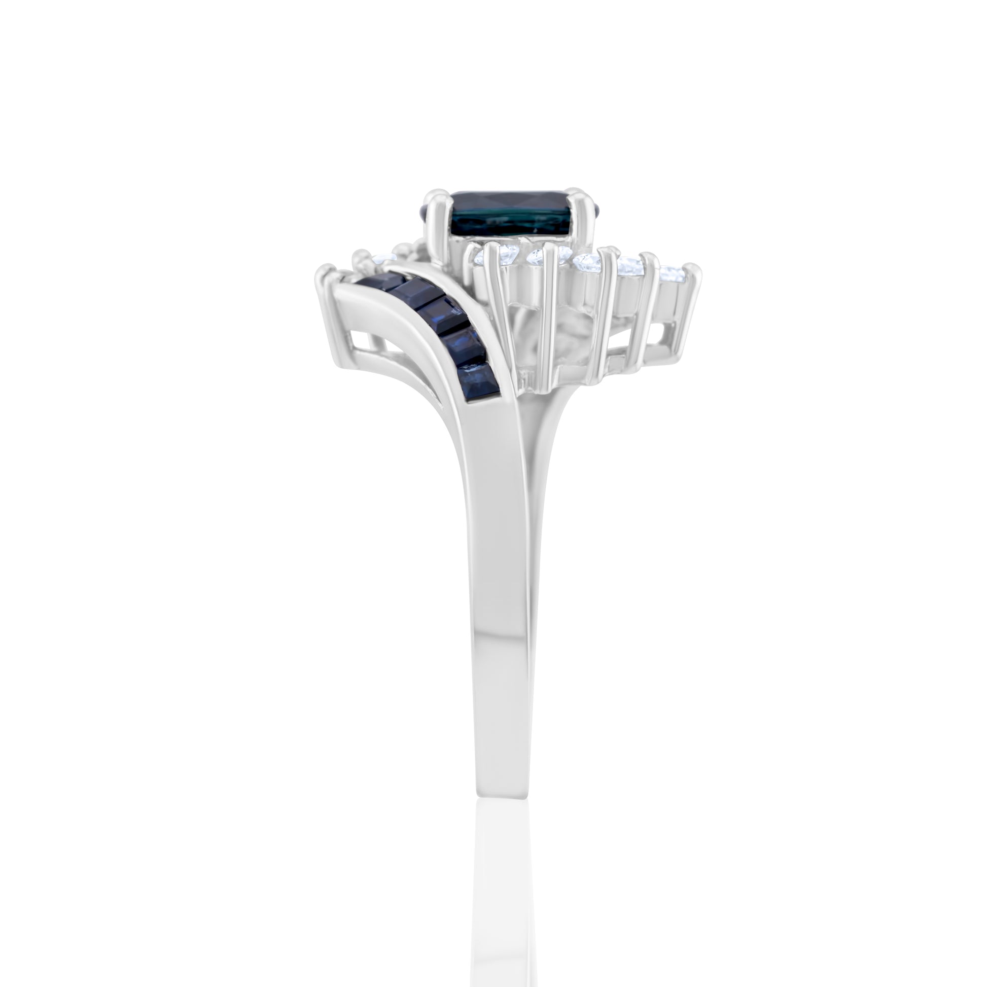 An ocean-deep sapphire rests between twin waves of diamonds, flowing in eternal motion. A captivating dance of light and mystery, crafted for the woman who moves with grace.