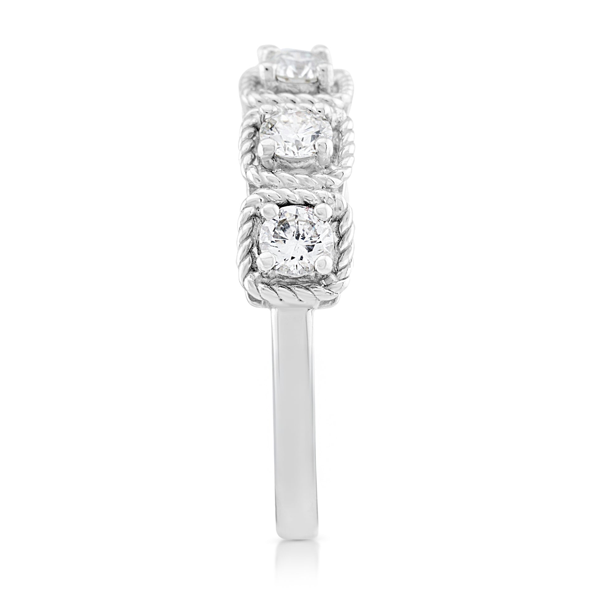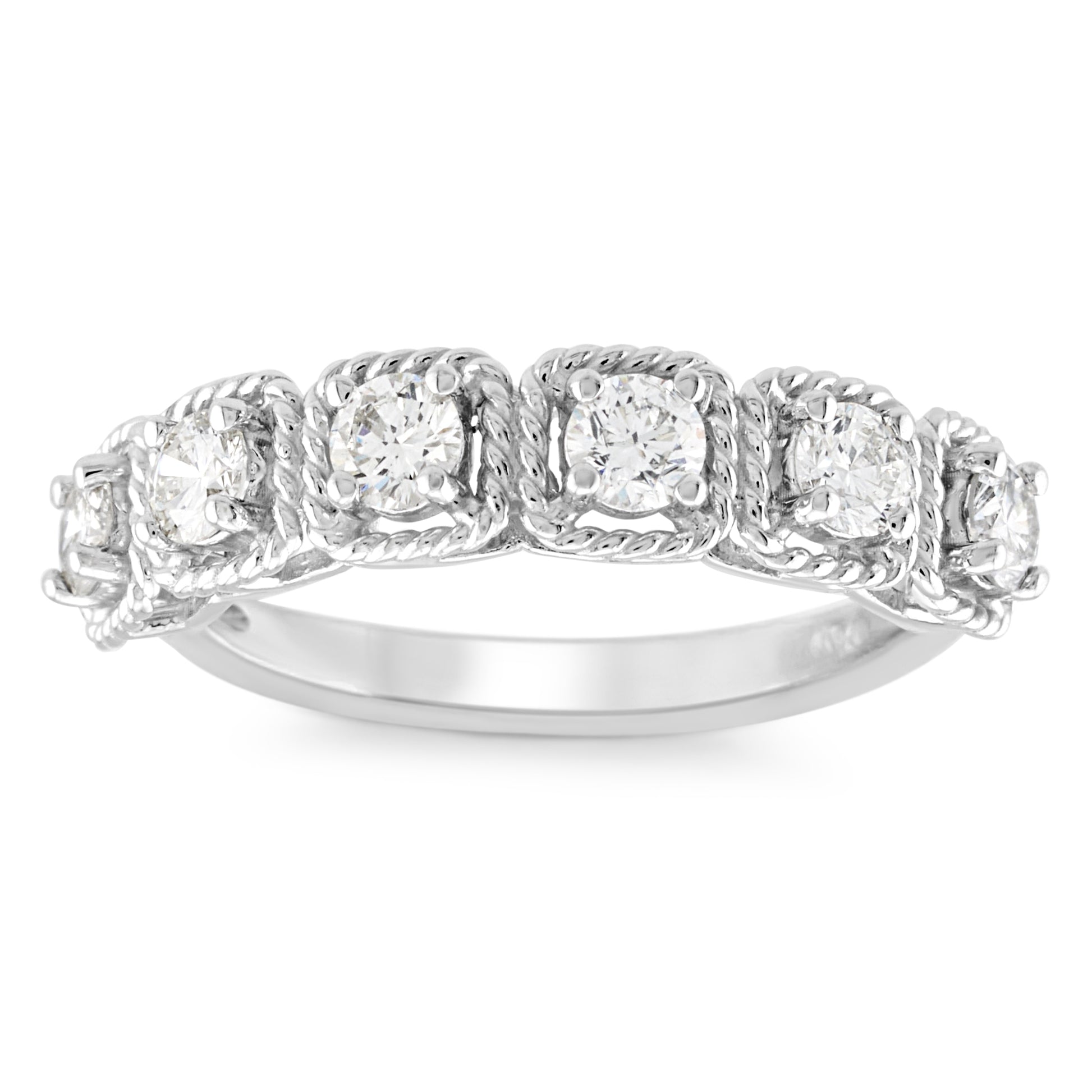 A refined take on classic elegance, this diamond band showcases intricate rope detailing that adds texture and charm to its brilliant sparkle. Its graceful design makes it the perfect choice for stacking, marking a milestone, or wearing as an everyday statement.