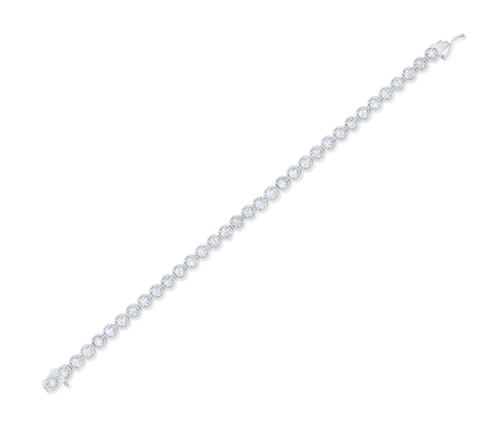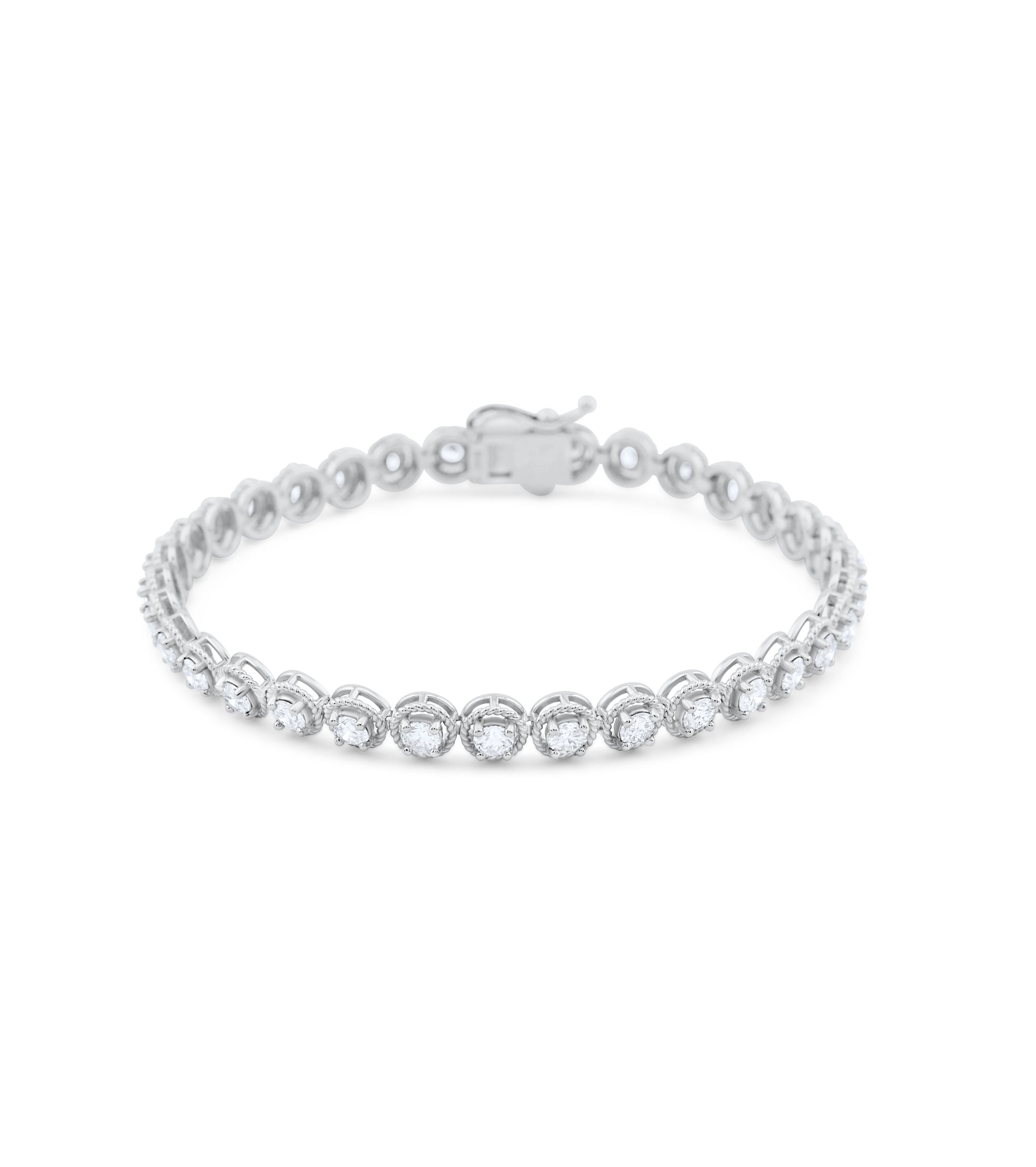 Exuding vintage charm, this antique-inspired tennis bracelet dazzles with over 3 carats of brilliant diamonds in a refined prong setting. Secured with a classic safety clasp, it’s a statement of enduring elegance and timeless luxury.