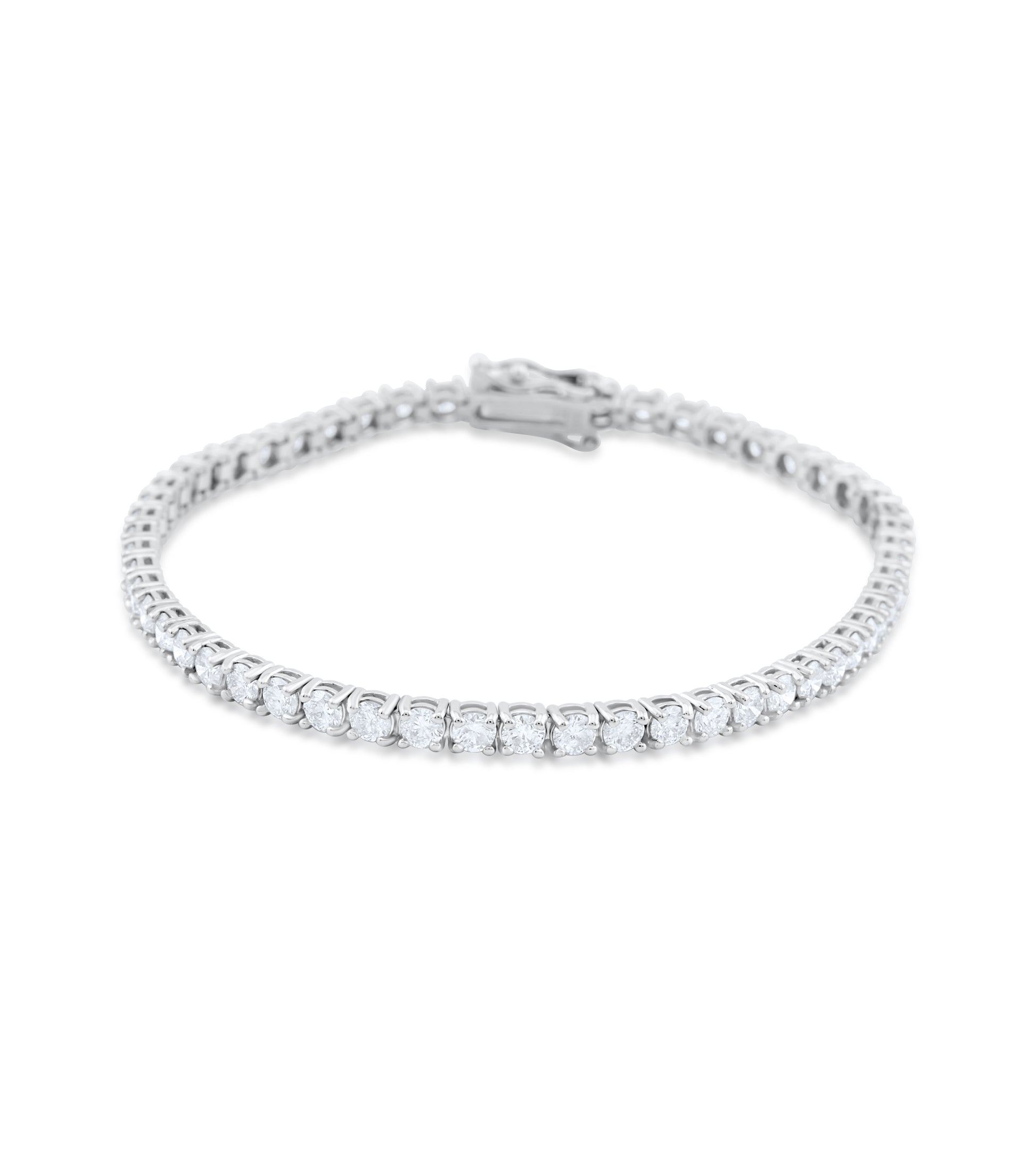 This timeless tennis bracelet showcases 5 carats of full cut round diamonds in classic 4-prong basket settings for maximum brilliance. Finished with a double safety clasp, it’s a bold yet refined piece designed for lasting beauty and secure elegance.