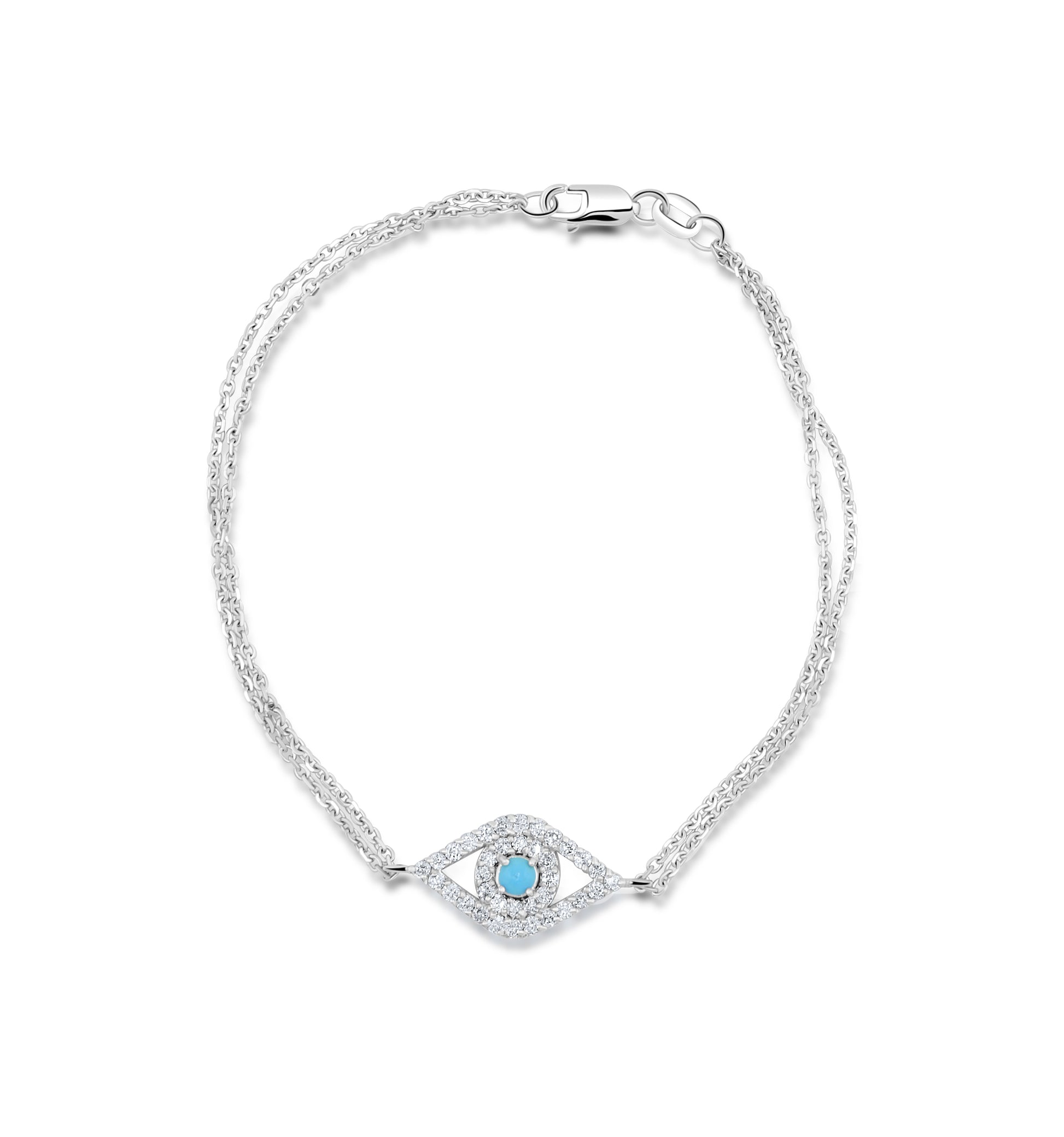 Radiating both beauty and protection, this turquoise and diamond bracelet features a double chain and secure lobster clasp for elegance with everyday wear. A perfect blend of sparkle and symbolism, it captures the timeless allure of the evil eye while bringing love and luck to every moment.