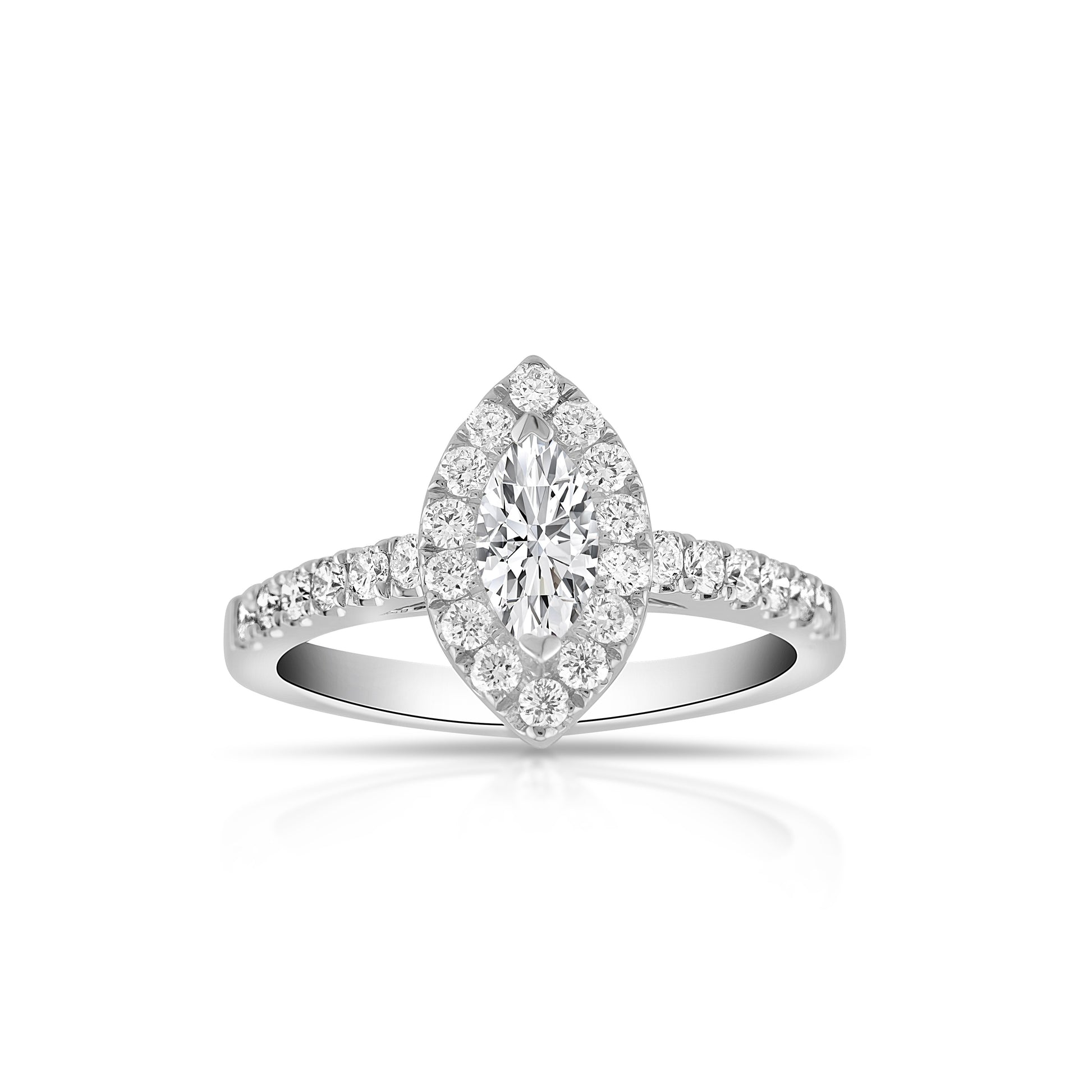 A striking marquise diamond elongates with graceful brilliance, framed by a halo of light that enhances its fiery allure. Radiant and refined, this design is a celebration of elegance destined to captivate forever.