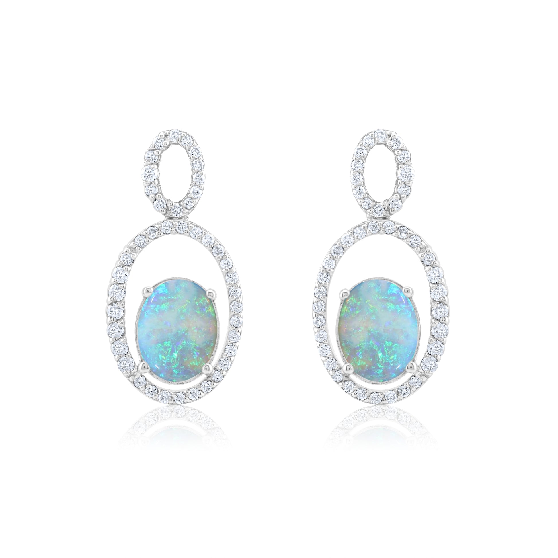 14K White Gold Opal & Diamond Drop Oval Earrings 3 Ct