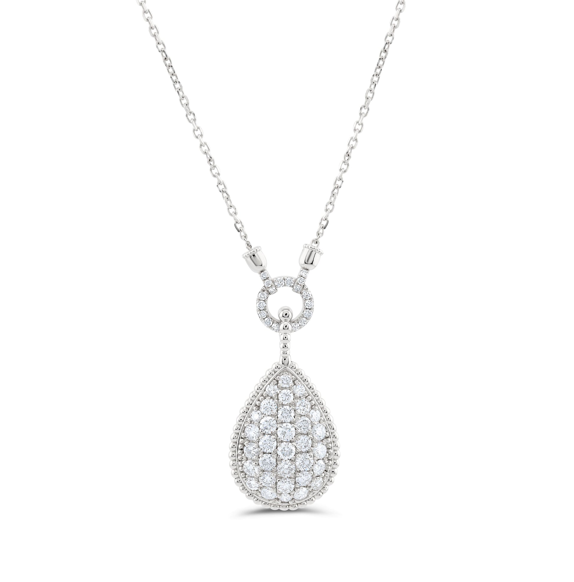 A romantic fusion of vintage charm and modern elegance, this teardrop pendant radiates with captivating brilliance. The soft curves and intricate milgrain accents lend a timeless feel, while its bold sparkle makes a confident, fashion-forward statement. Perfectly poised to elevate any look with effortless grace.