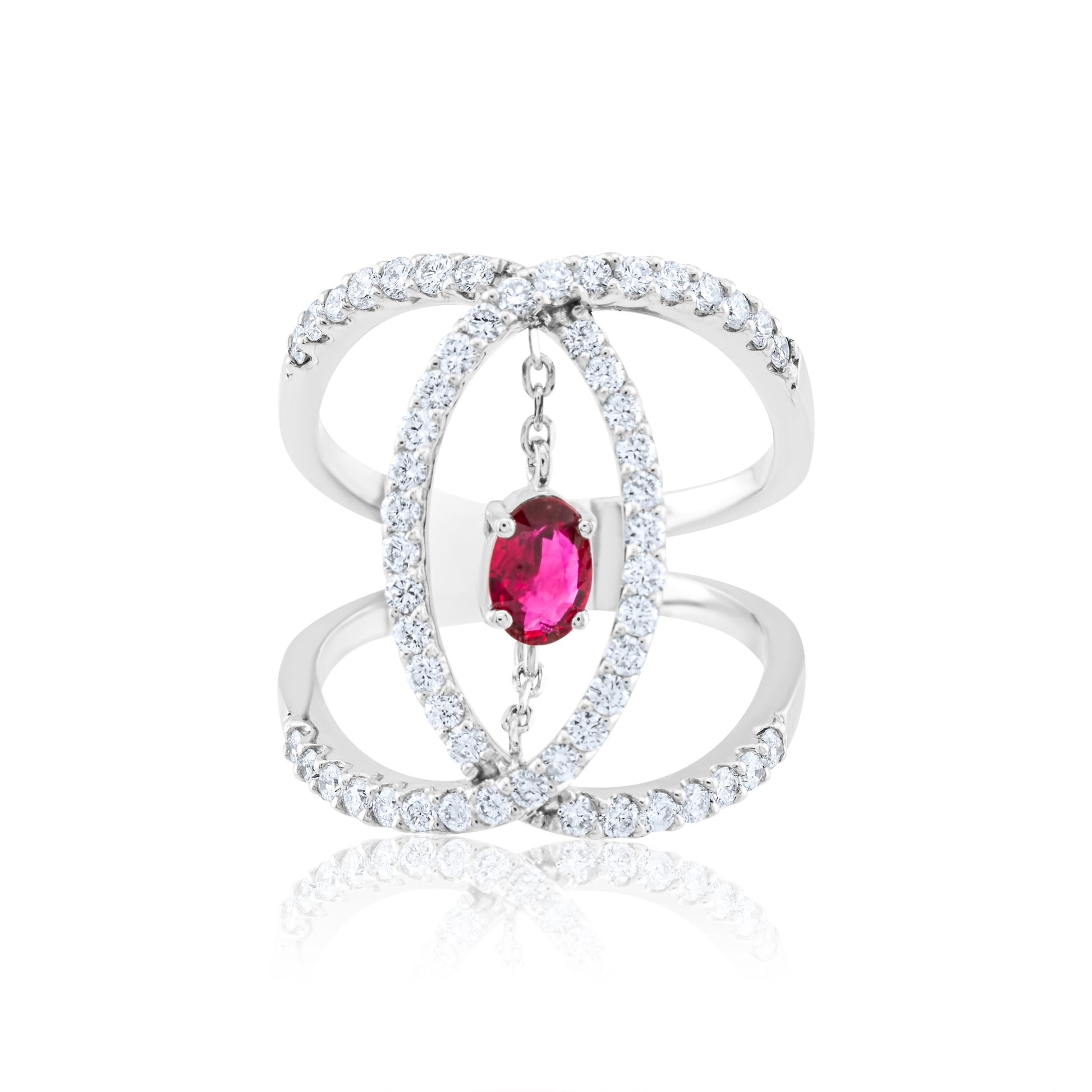 A daring fusion of elegance and edge, this double-band ring showcases a vibrant ruby suspended within a sparkling diamond-encrusted oval, creating a mesmerizing floating effect. Designed to captivate from every angle, it’s a statement piece that can be worn on any finger and that brings passion and brilliance together in perfect harmony.