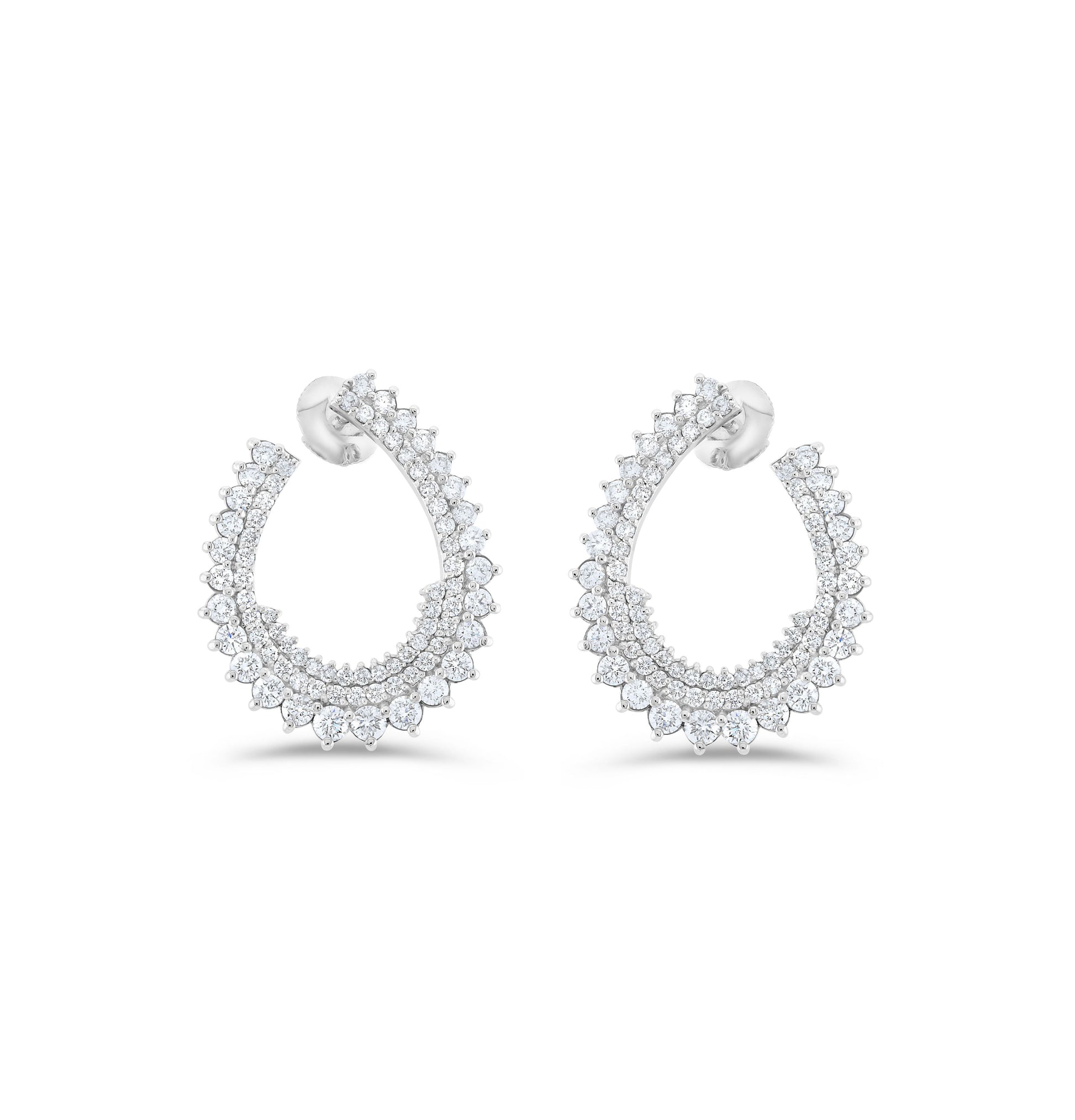 Radiating with shimmer, these scalloped earrings capture the essence of romance in every curve. Their luminous silhouette and intricate craftsmanship make them a captivating choice for any occasion that calls for elegance.
