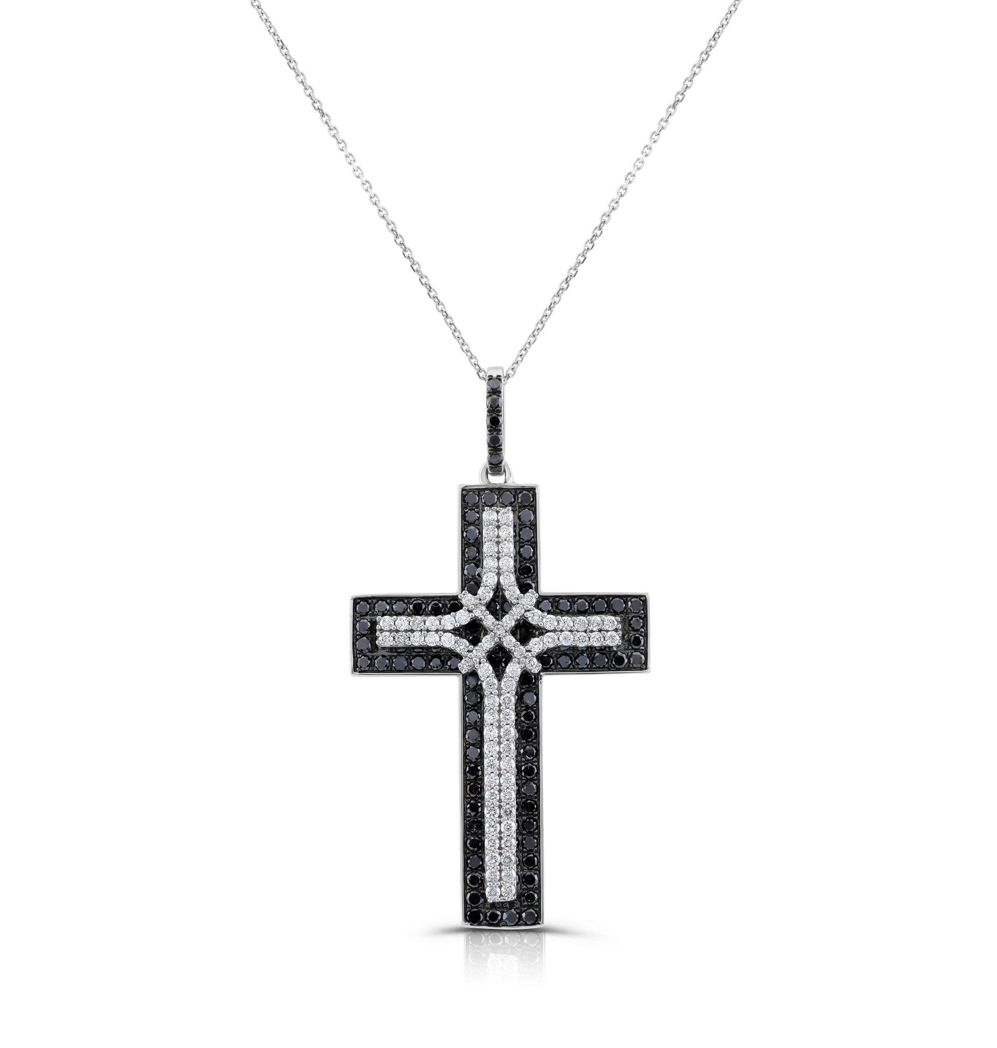 A striking interplay of light and shadow, this cross pendant unites the brilliance of white diamonds with the depth of black diamonds in perfect harmony. Bold and elegant, it stands as a timeless symbol of faith, strength, and refined style.