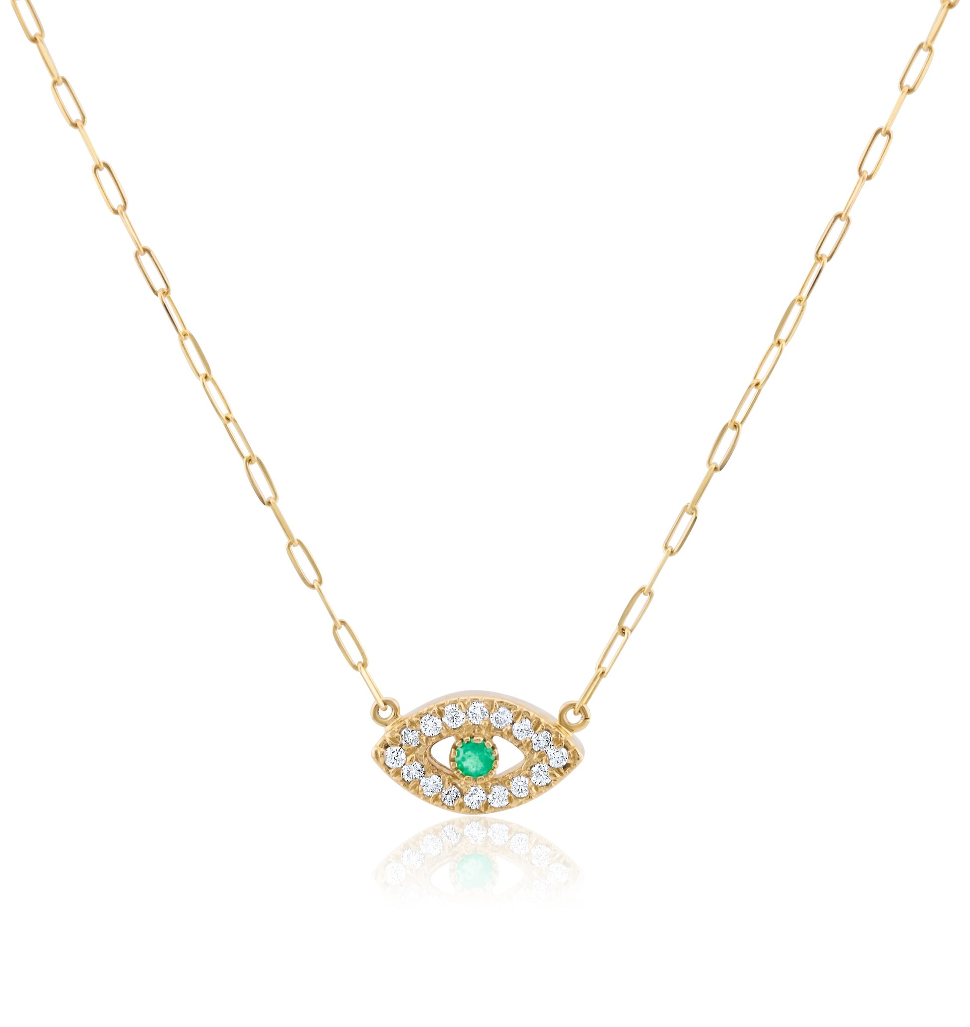 A symbol of protection with a romantic twist, this captivating evil eye necklace glows with the lush allure of a vivid green emerald embraced by a halo of radiant diamonds. Set in warm 14K yellow gold, it’s a timeless charm designed to guard your heart and captivate theirs.