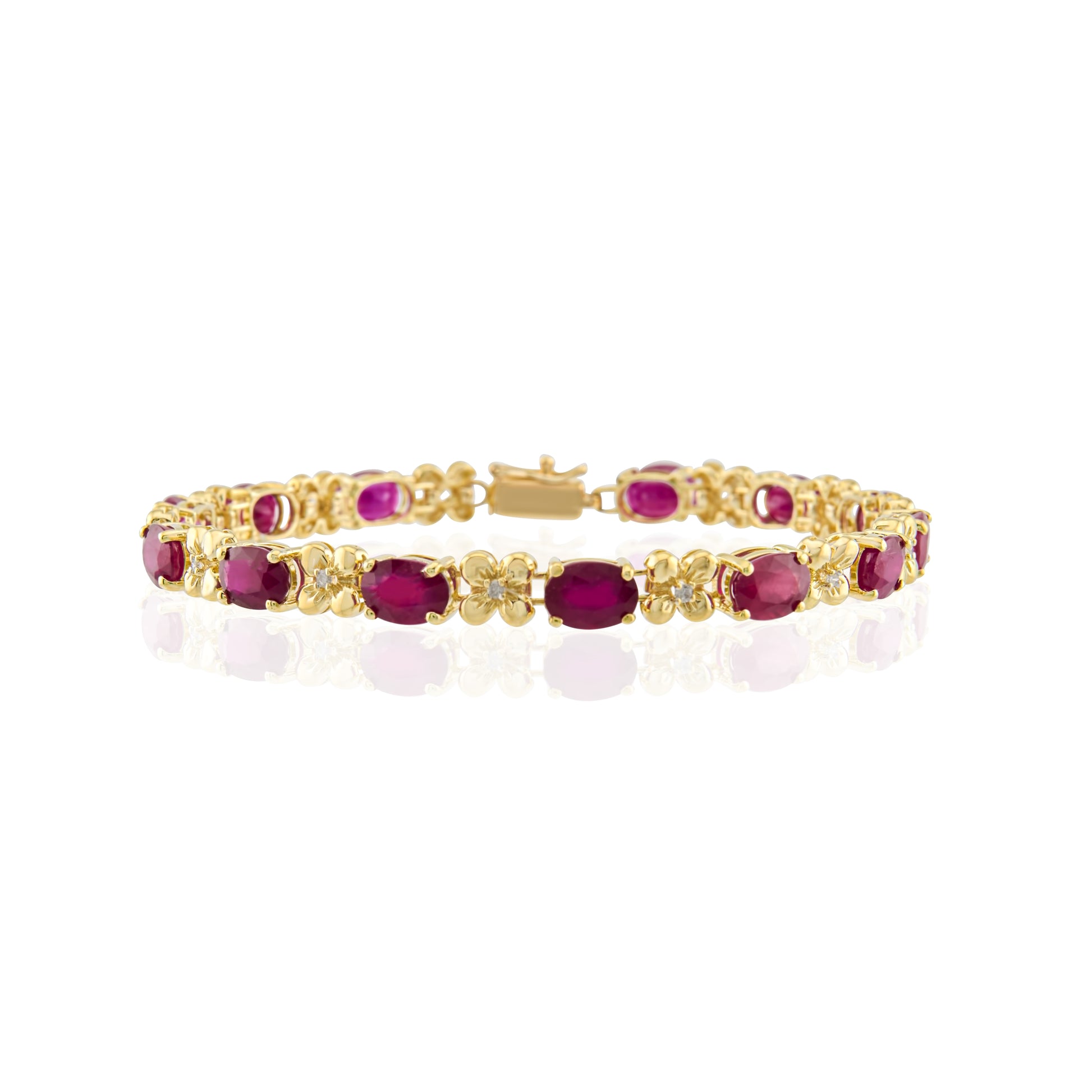 Bold and romantic, this tennis bracelet pairs vivid oval rubies with sparkling clarity enhanced diamonds in a striking display of color and brilliance. Set in rich yellow gold with a secure safety clasp, it’s a luxurious statement of passion and elegance.