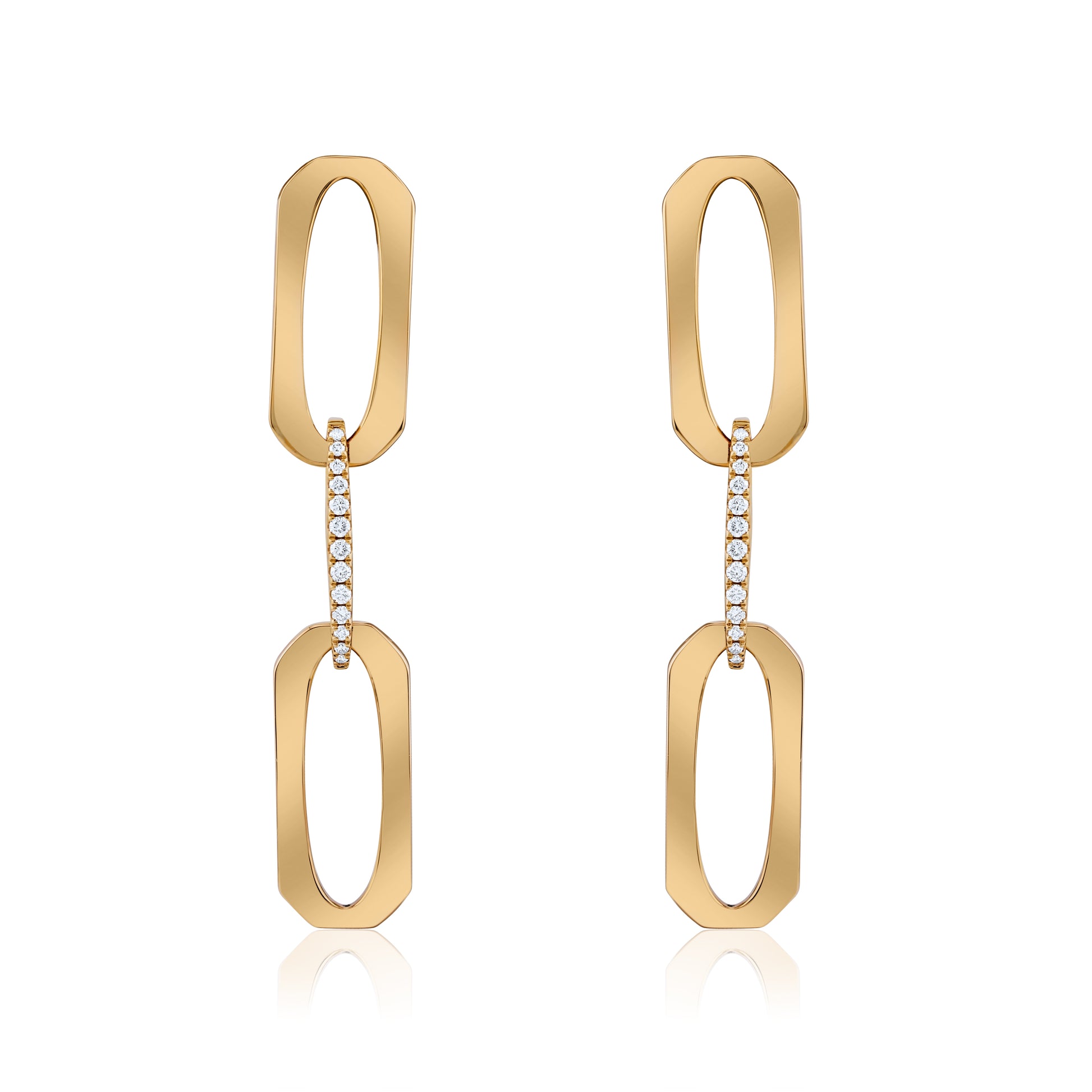 Striking and sculptural, these drop earrings feature two bold gold links framing a center link shimmering with pavé-set diamonds. A modern fusion of elegance and edge, they radiate effortless confidence and romantic allure.