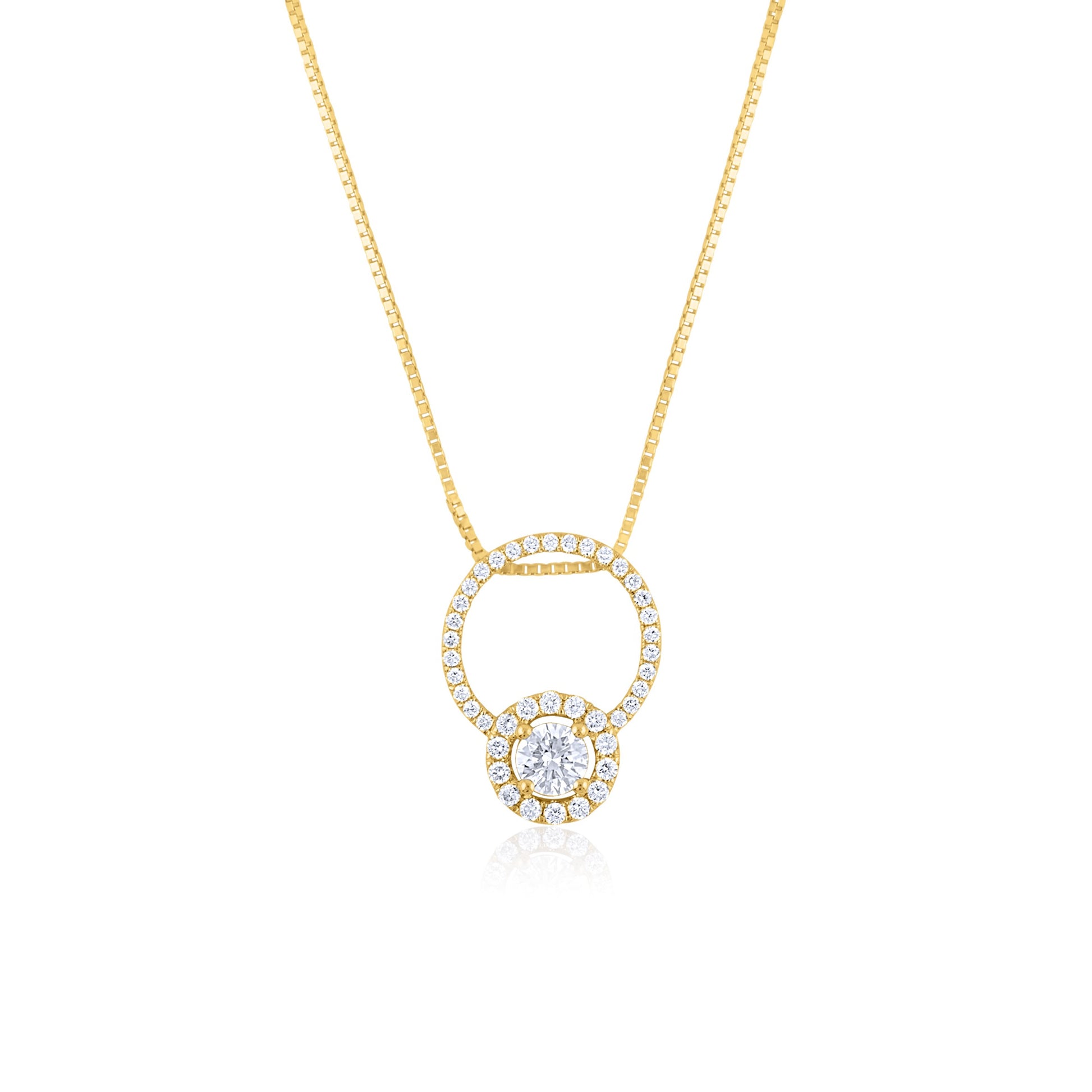 Two luminous circles of gold and diamonds intertwine in perfect harmony around a radiant centerpiece. A timeless emblem of elegance and brilliance, this pendant is crafted to capture the light—and every heart.