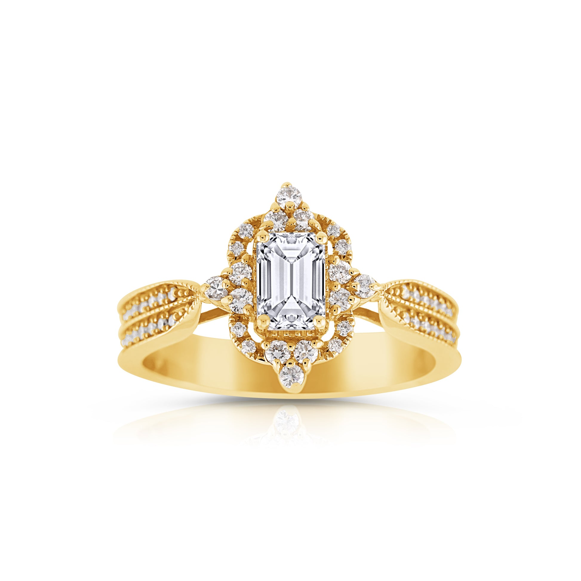 An emerald-cut diamond radiates with refined brilliance, framed by a halo of light and set upon a golden band with vintage allure. Regal and romantic, this creation is a timeless treasure of elegance and devotion.
