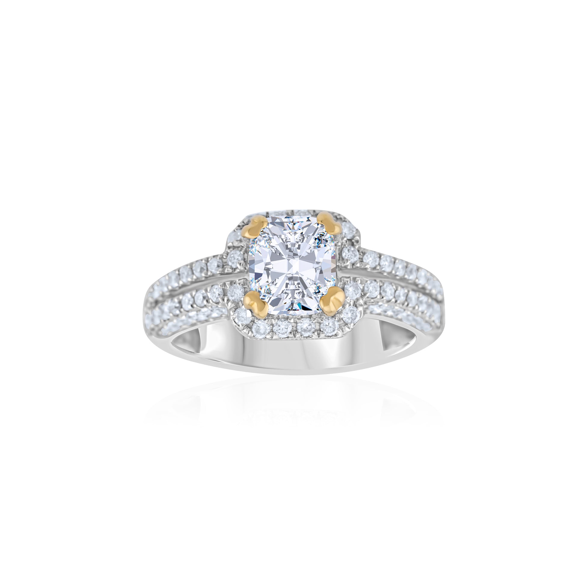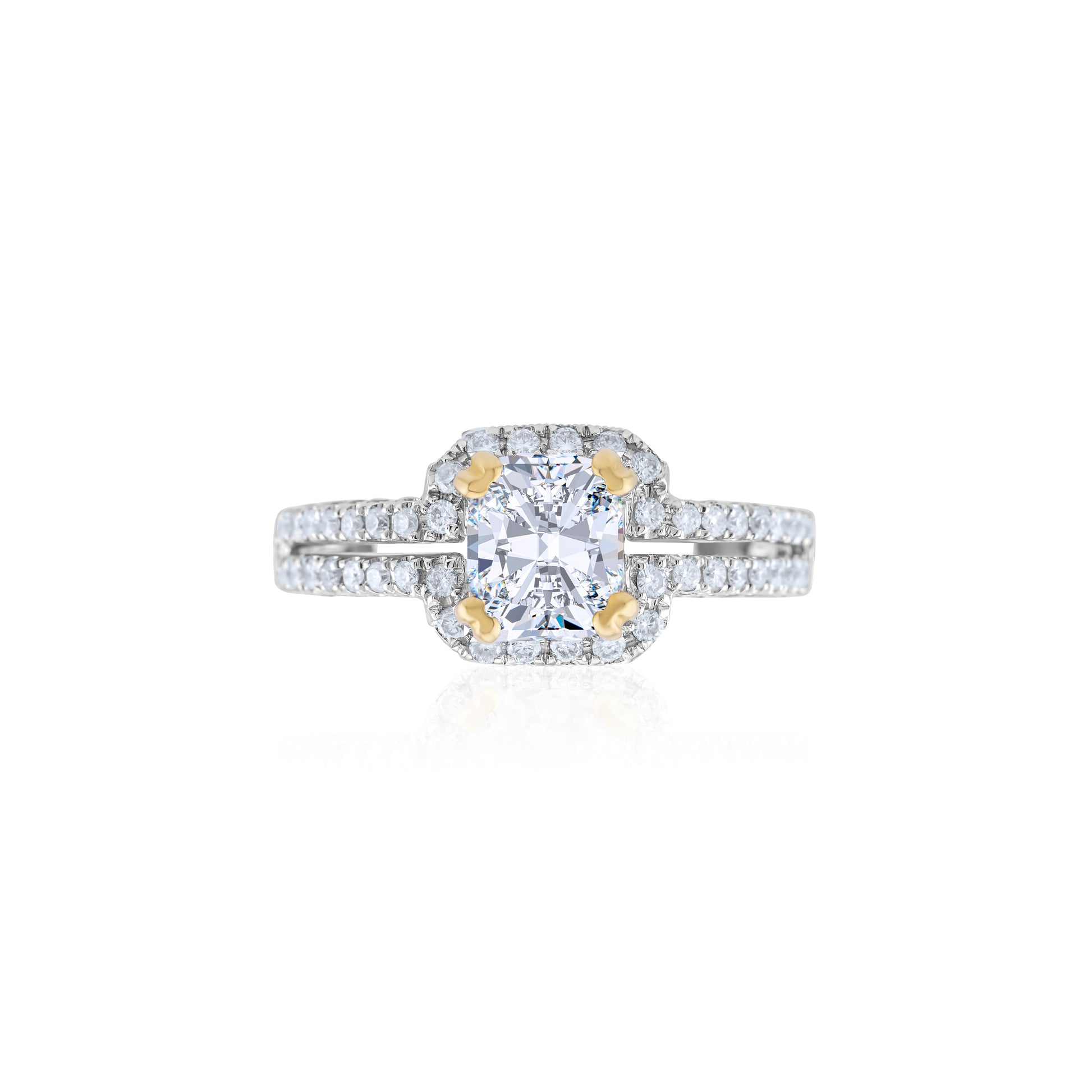 A radiant cushion of light canary yellow glows at the heart of this design, embraced by a pavé halo and split band of brilliant diamonds. Set in white and yellow gold, it is a striking harmony of color, brilliance, and timeless elegance.
