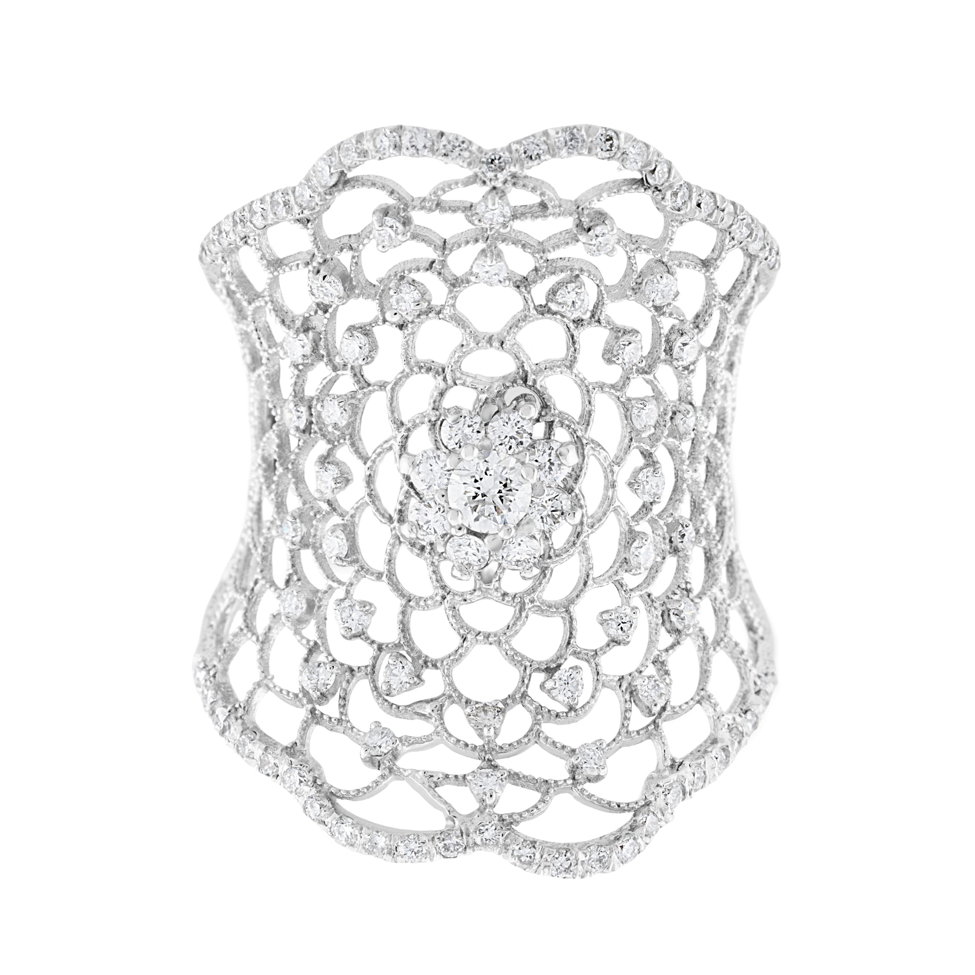 Intricate and airy, this lace-inspired design shimmers with diamond accents that create a floral motif at its heart. A stunning fusion of craftsmanship and elegance, it’s the perfect statement ring for those drawn to artistry and sparkle.