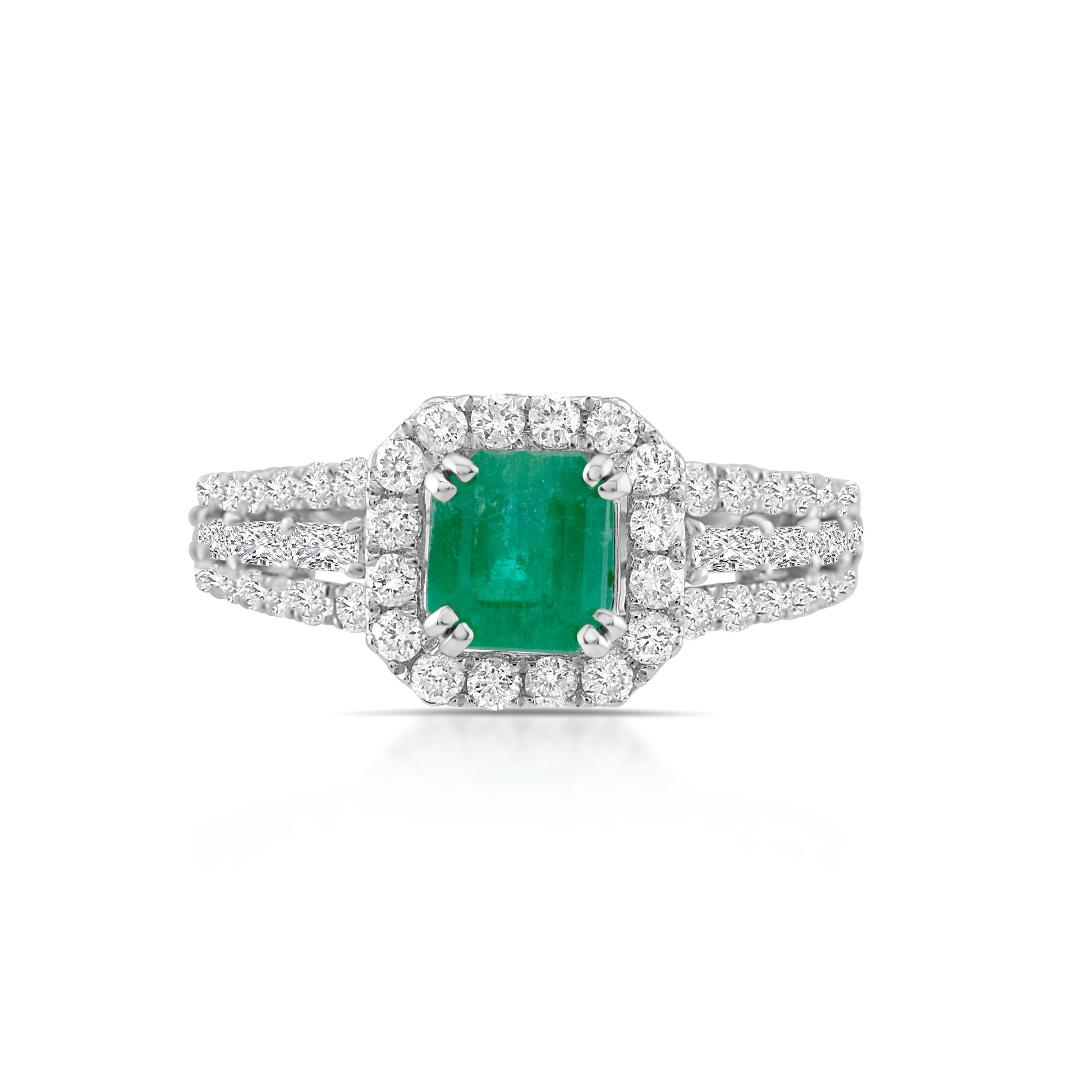 A luminous symphony of color and brilliance, this ring showcases a vibrant emerald embraced by cascading rows of diamonds. Exuding elegance and allure, it tells the story of enduring love wrapped in timeless sophistication.