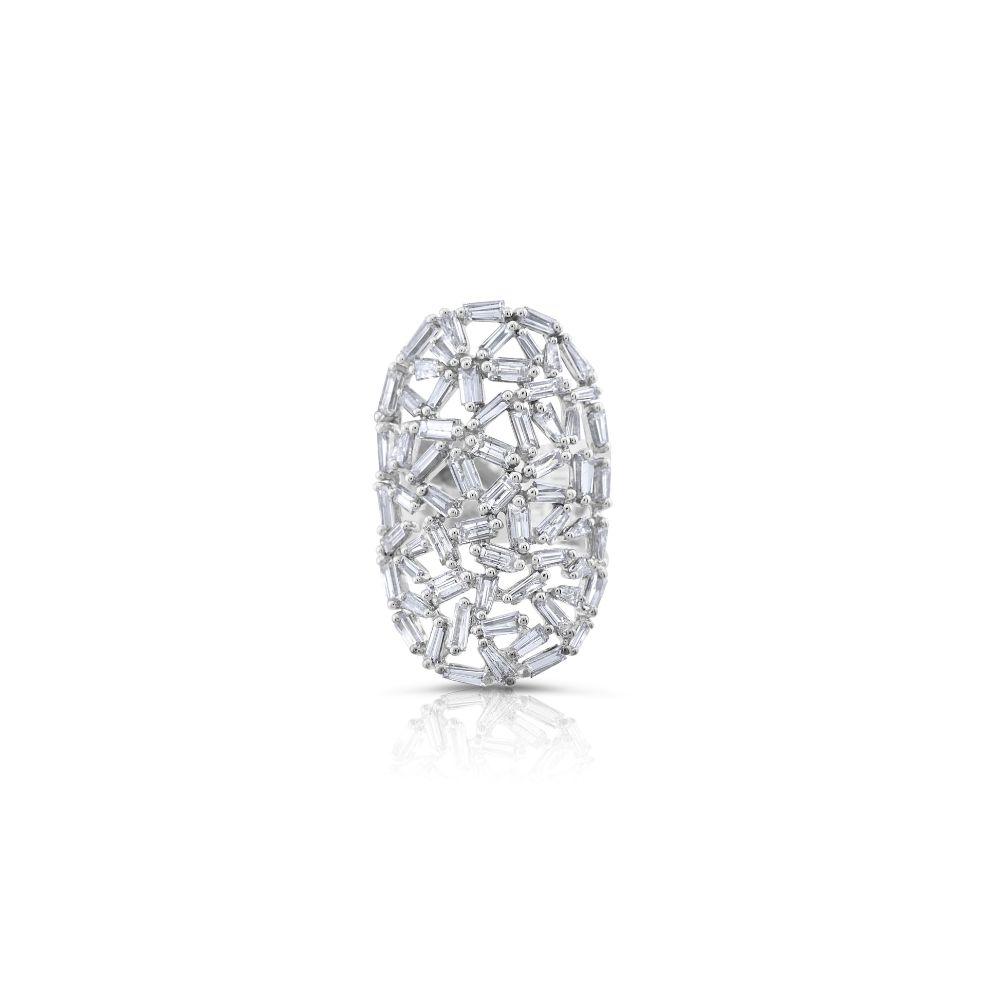 An artful constellation of diamonds, this design layers baguette and round cuts in a striking openwork pattern that dazzles from every angle. Sculptural and luminous, it is a bold expression of modern elegance and timeless allure.
