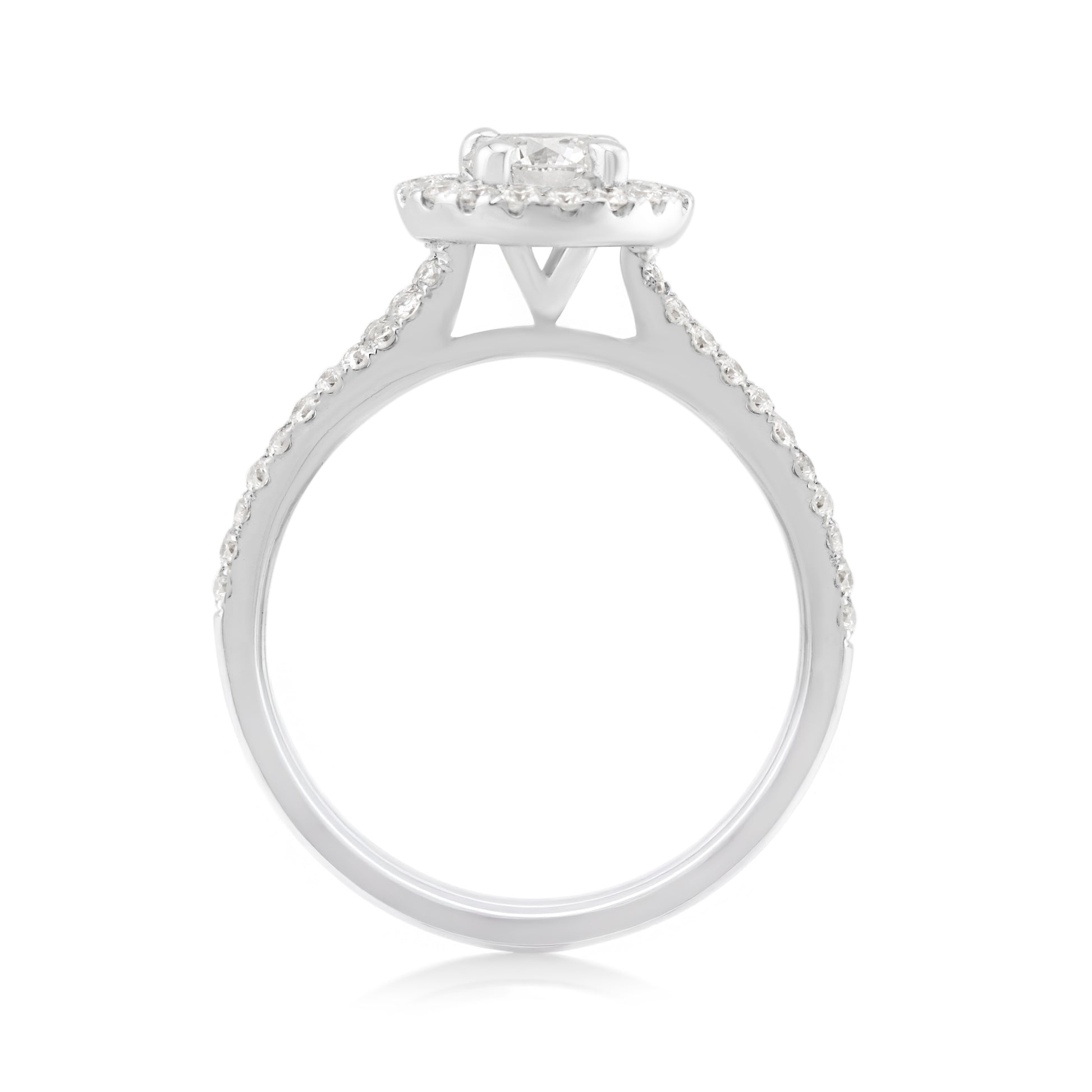 This romantic engagement ring dazzles with a brilliant center diamond wrapped in a constellation of light-catching accents. Crafted in luminous white gold, its timeless elegance and radiant sparkle celebrate a love that shines from every angle.