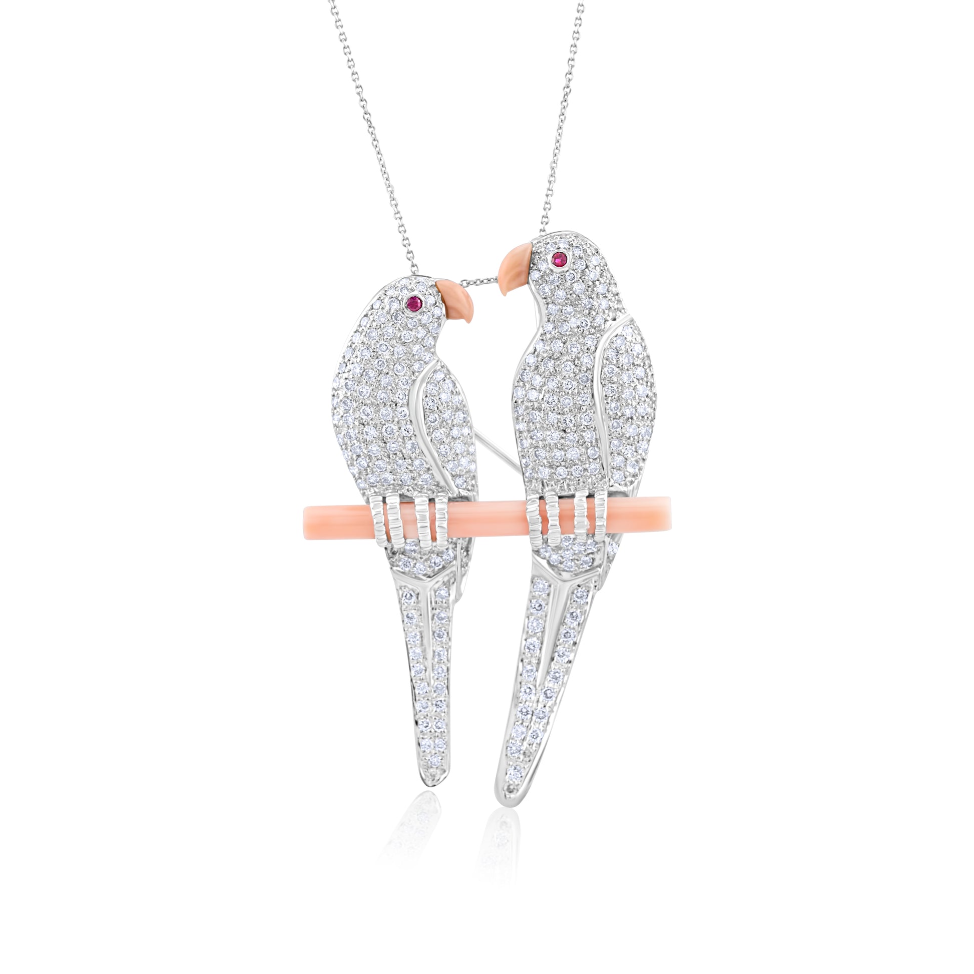 18K White Gold Diamond Parrots Brooch & Pendant ~ 3½ Ct