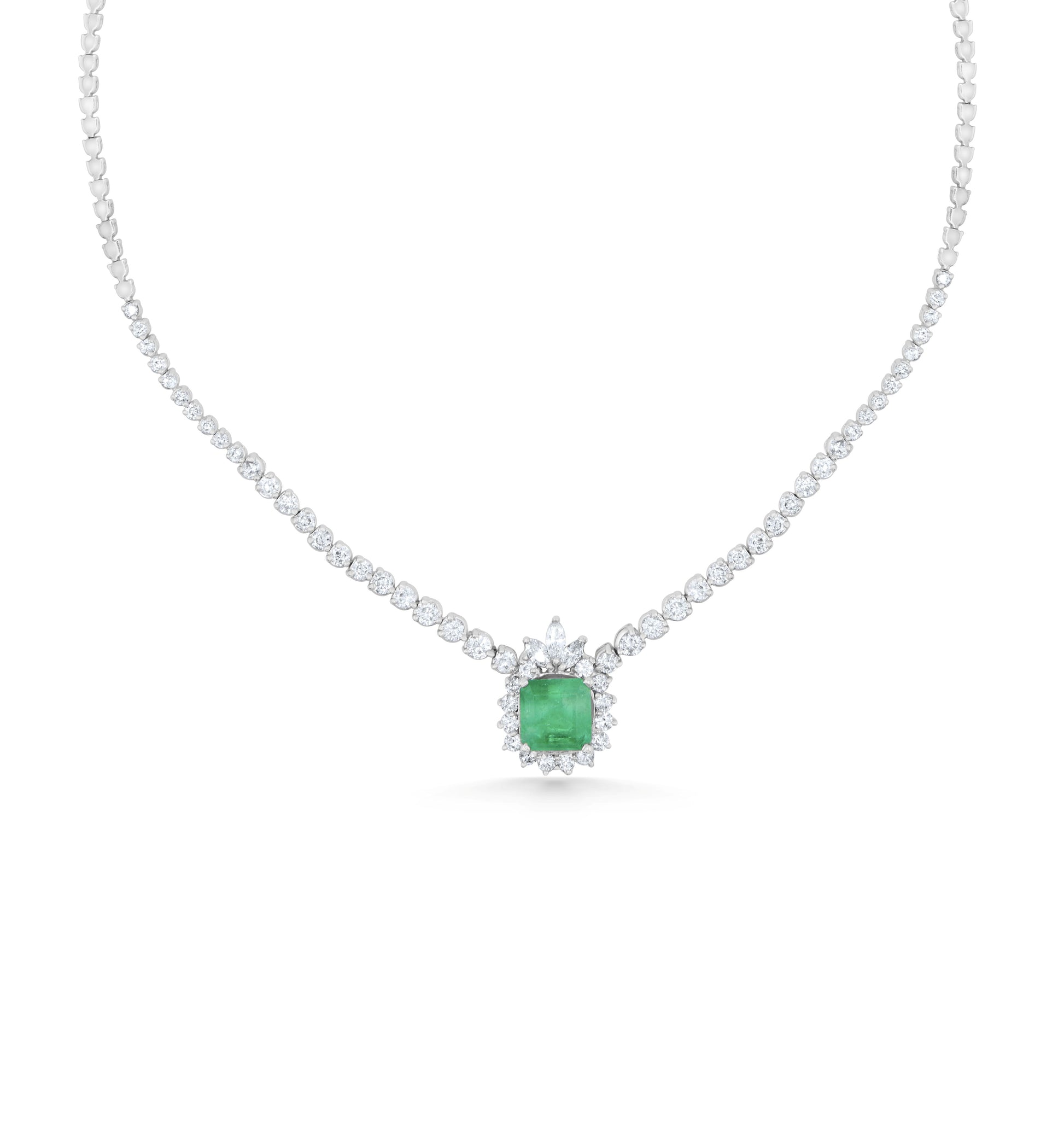 A masterpiece of sophistication, this necklace showcases a vivid square-cut Colombian emerald framed by a dazzling crown of marquise and round diamonds. Crafted in 18K white gold, it’s an heirloom-worthy treasure that radiates timeless elegance and regal charm.