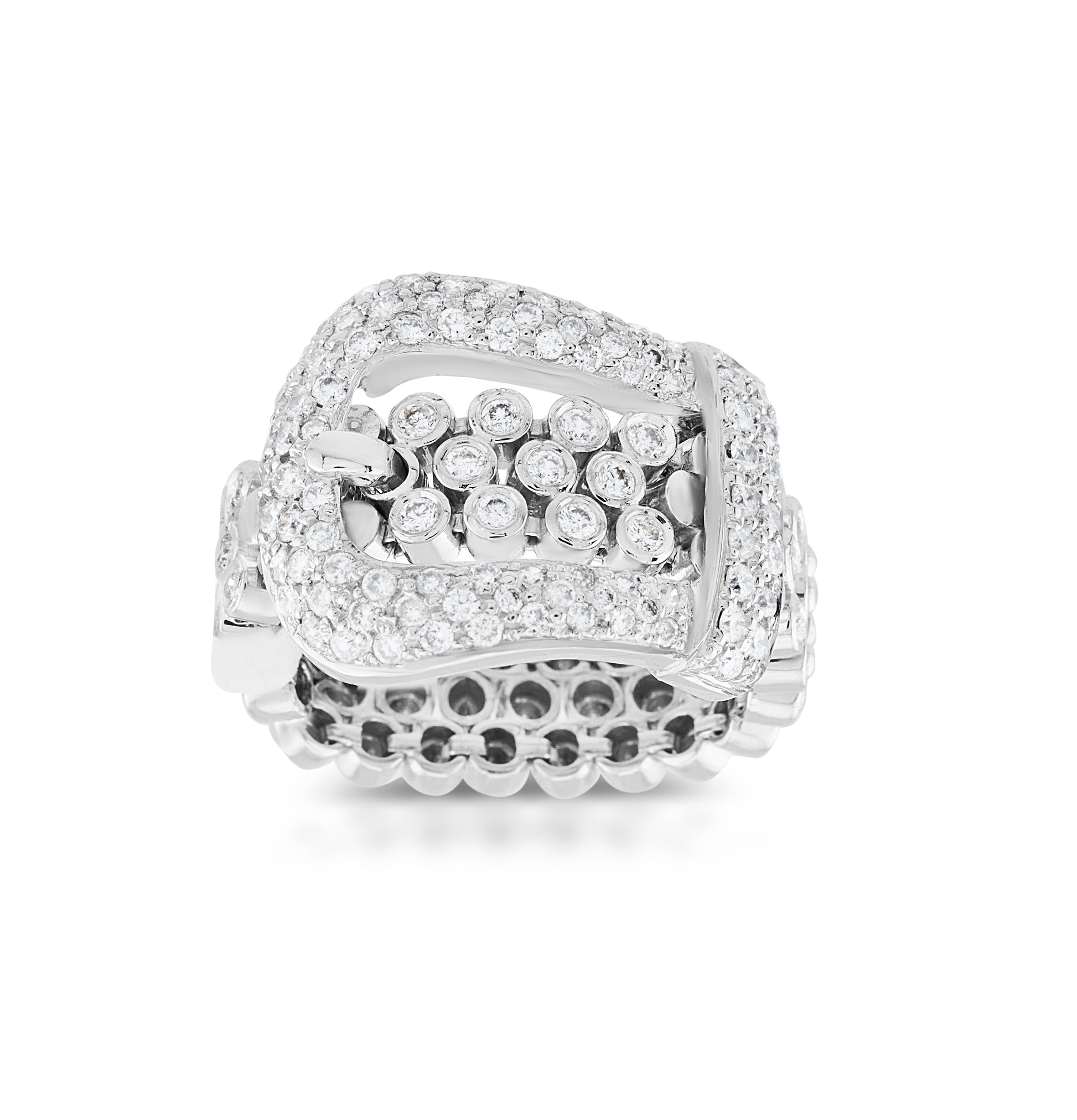 A statement piece crafted with meticulous attention to detail, this luxurious buckle-style ring combines pavé-set diamonds with bezel-set brilliance. Its flexible band and dynamic design add both comfort and contemporary style, making it a fashion standout addition to any fine jewelry collection.