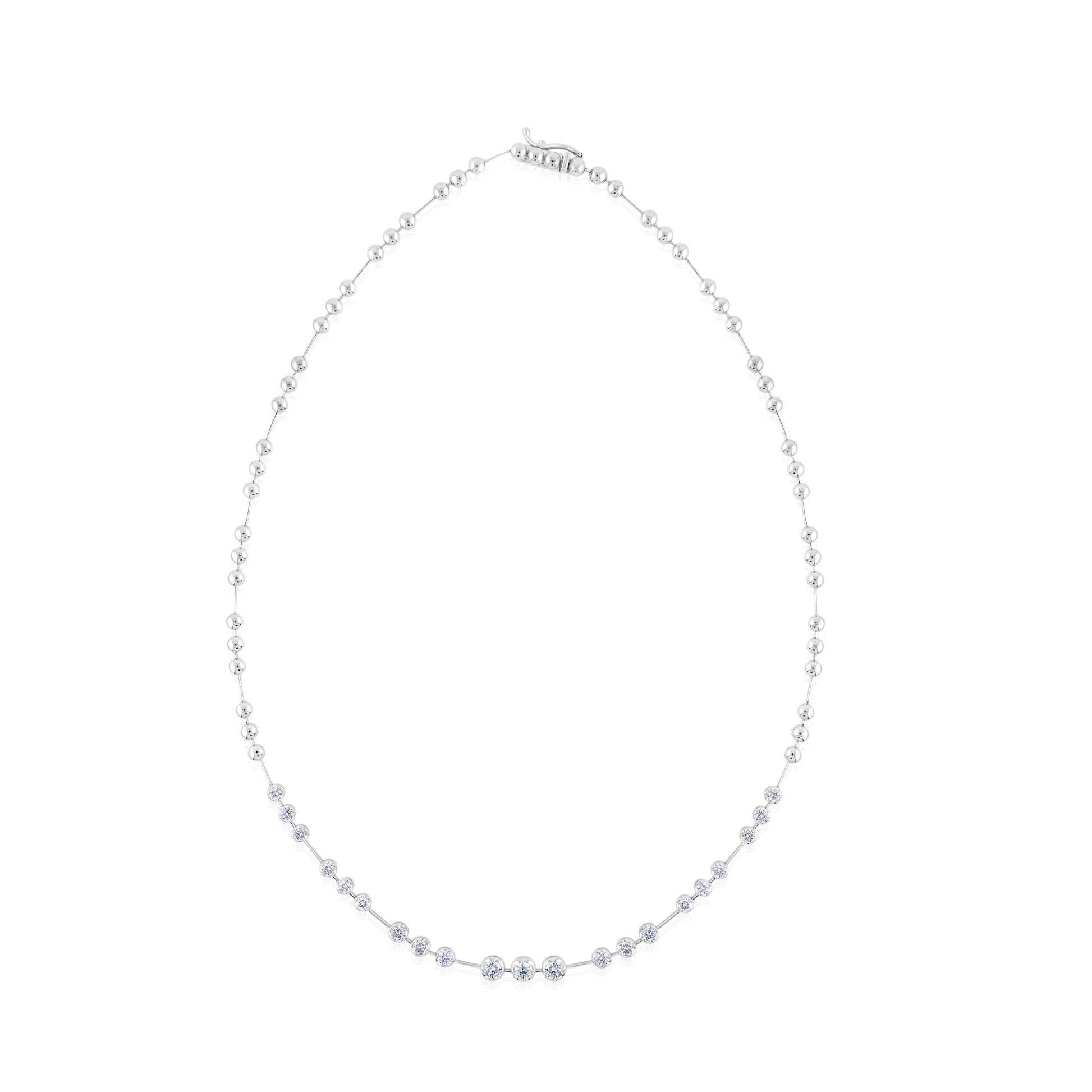 A graceful stream of light, this diamond necklace drapes with effortless sophistication. Each sparkling gem dances along the neckline, embodying pure elegance and modern allure.