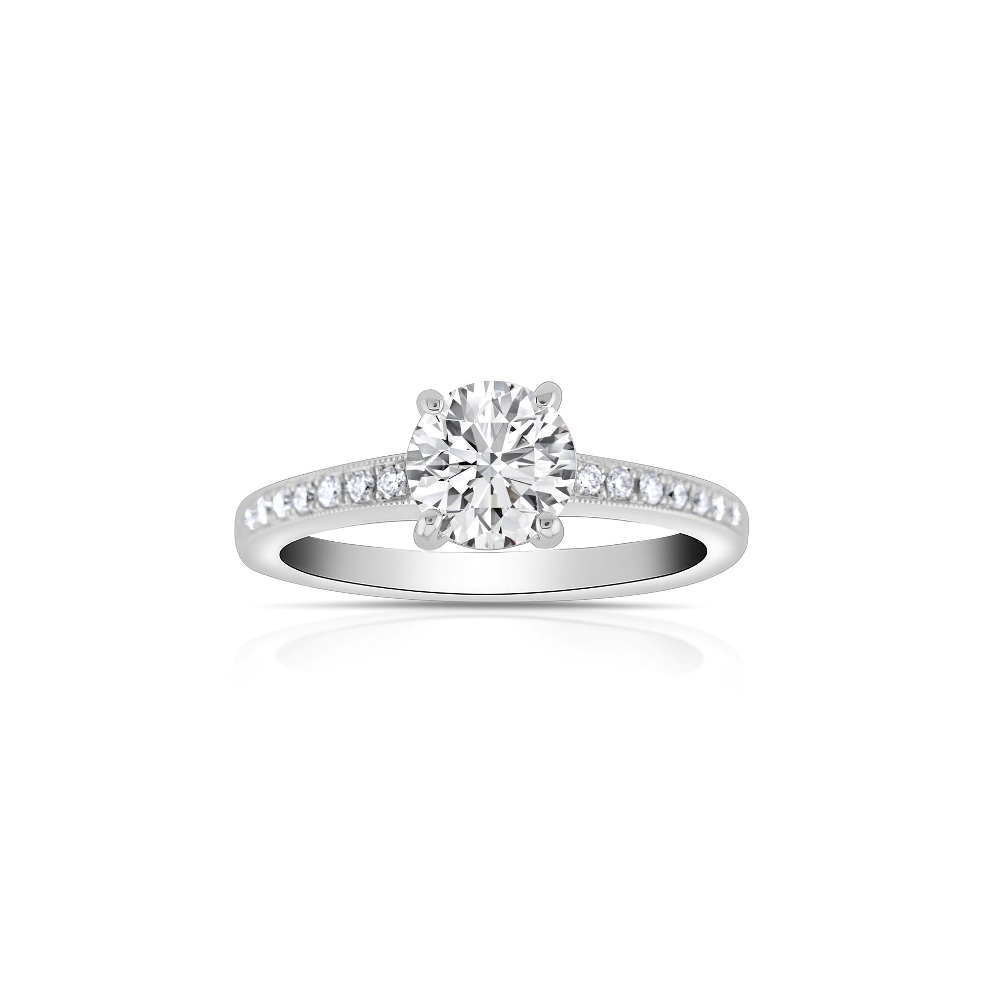 A brilliant round diamond takes center stage, its fire enhanced by a pavé band of shimmering stones. Refined and eternal, this creation is a luminous symbol of love’s most radiant moments.