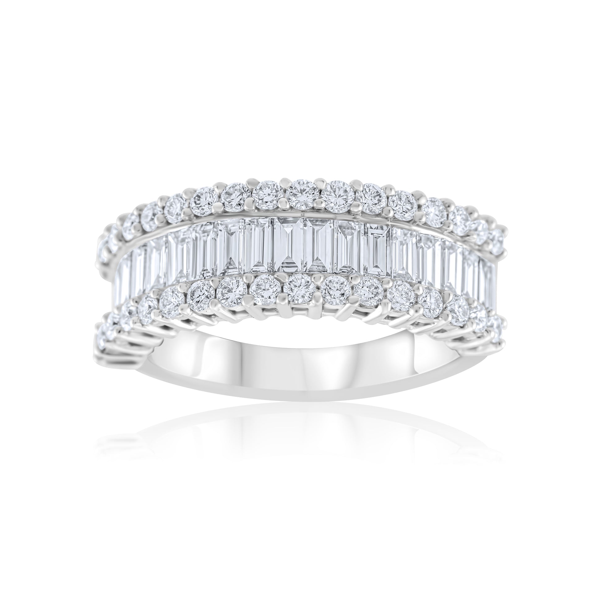 A striking fusion of elegance and precision, this band showcases a river of baguette diamonds framed by shimmering rows of brilliant rounds. Bold and refined, it captures timeless luxury in every facet.