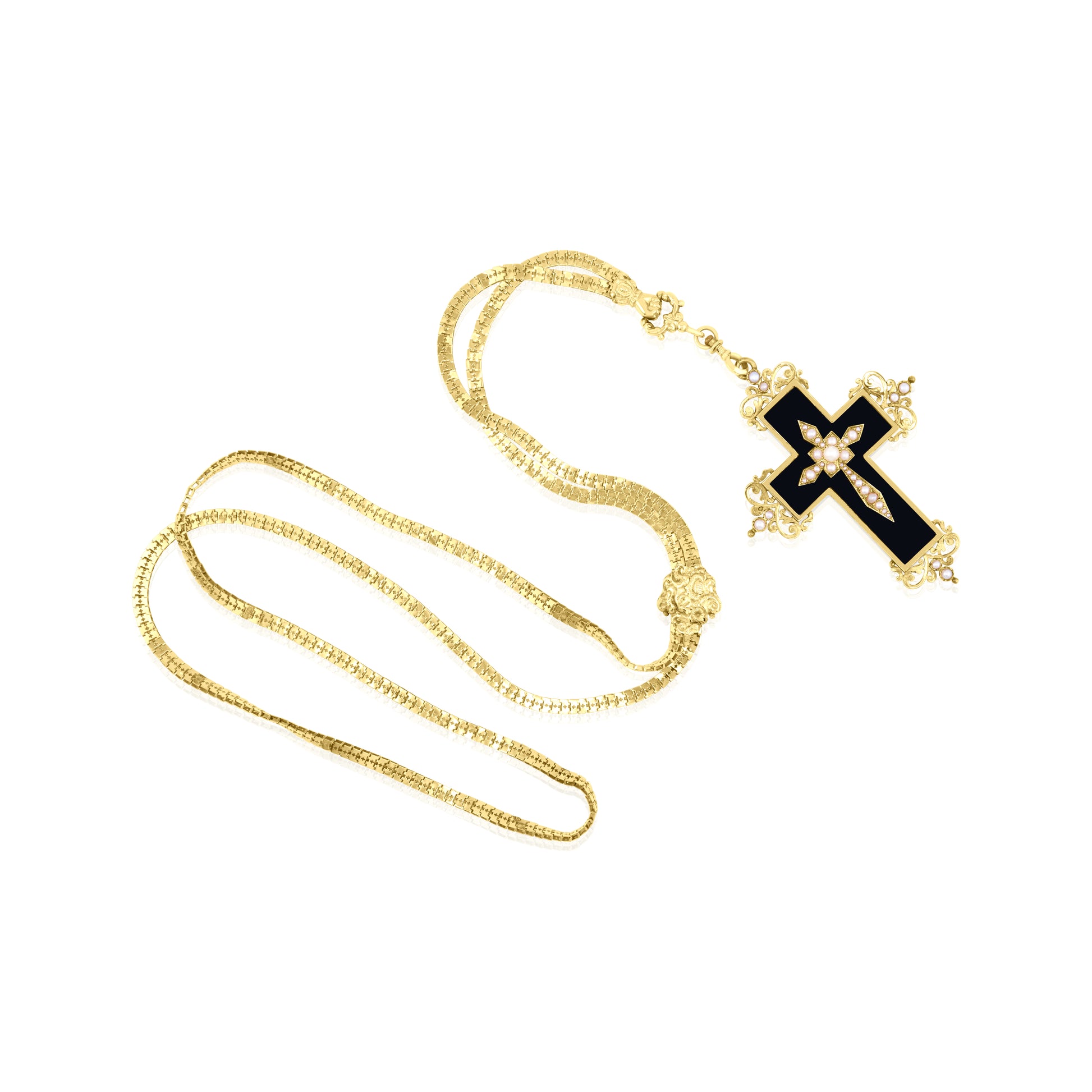 18K Yellow Gold Onyx & Pearl Cardinal Fleur-de-Lis Cross Necklace
