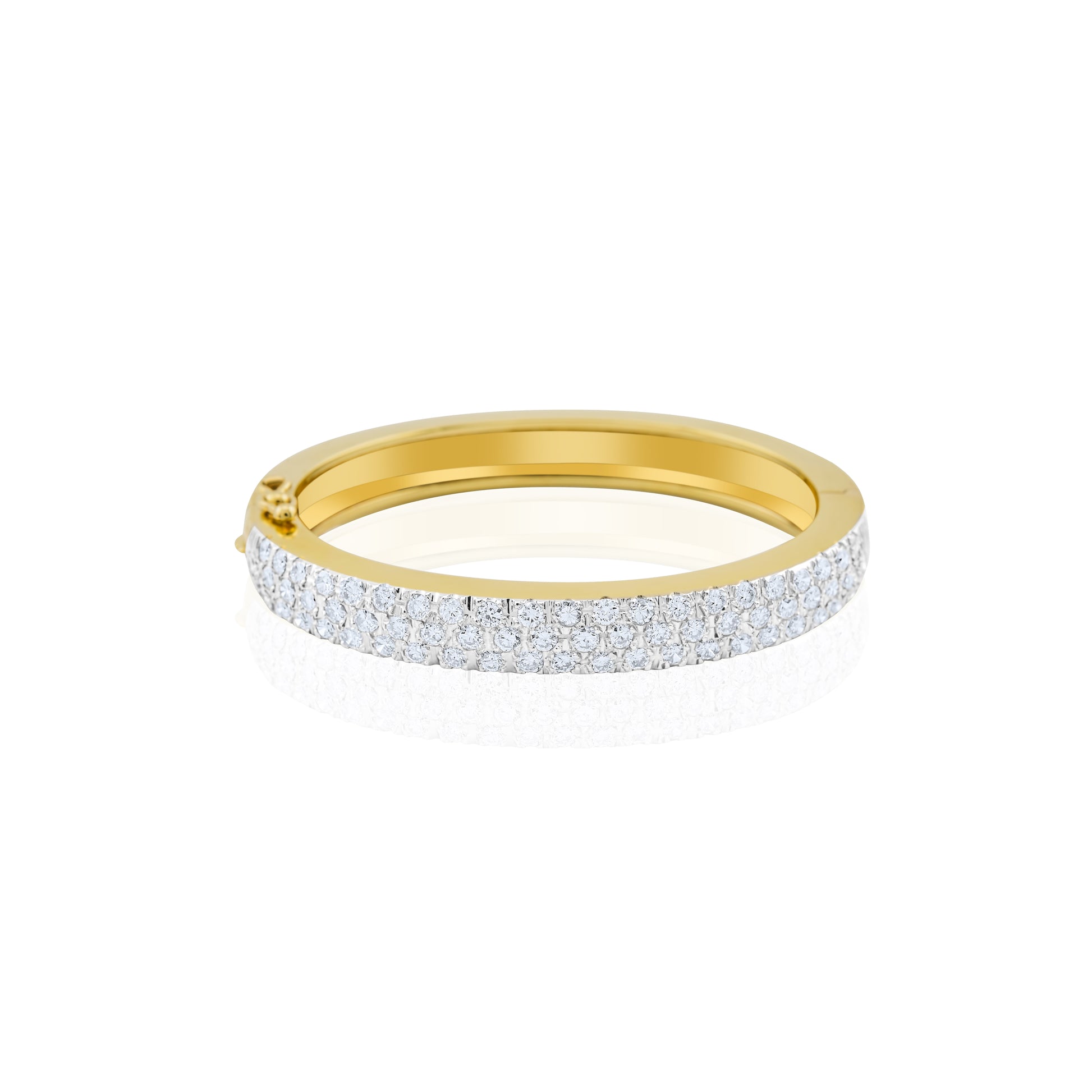 This timeless diamond bangle radiates elegance, with its three rows of brilliant round diamonds set in warm 18K yellow gold for a look of refined luxury. Designed to shine with effortless sophistication, it’s the perfect finishing touch for any occasion.